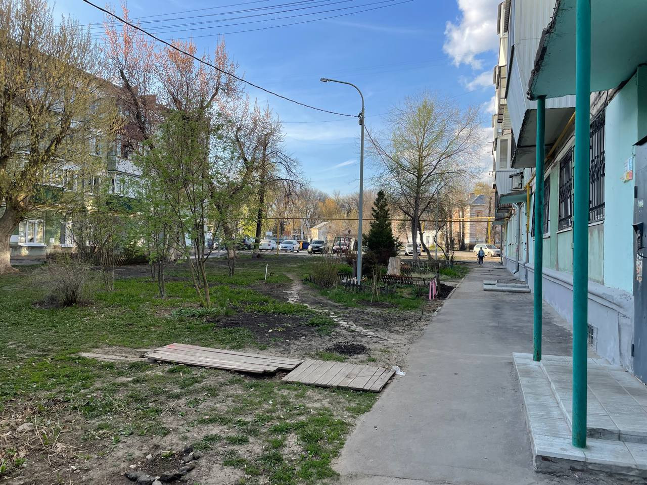 Во дворе тихо, шума проезжающих машин не слышно.