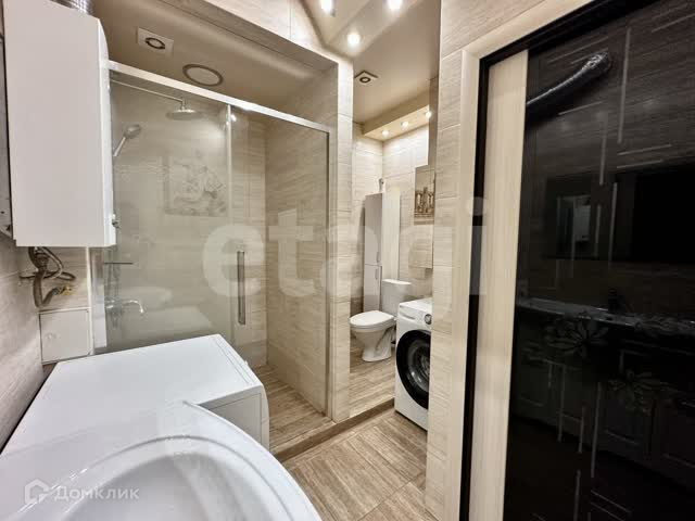 с душевой кабиной из плитки, вложенной до потолка, и стеклянной перегородой,