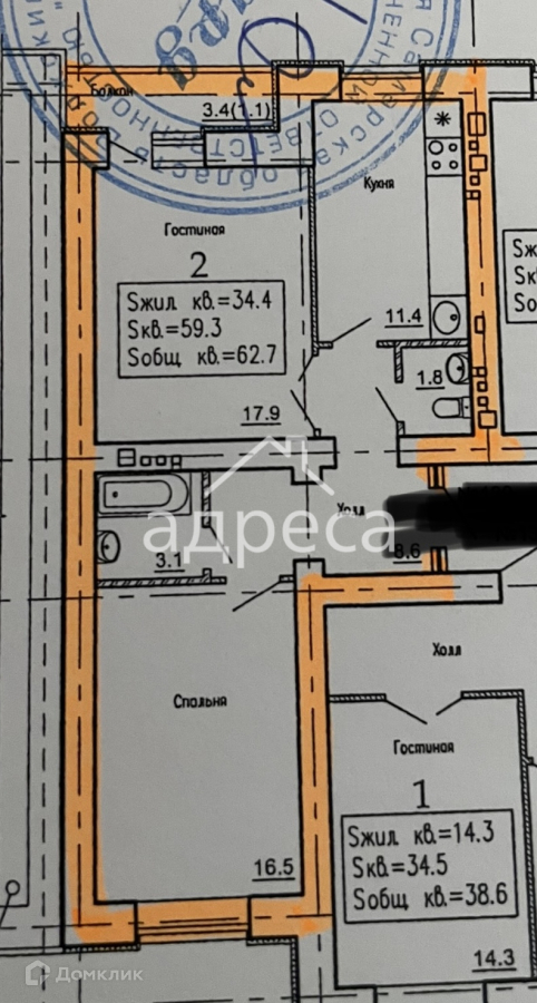 Жилая площадь 34.4 м2