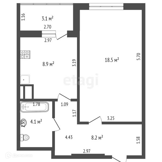 Общая площадь 41.3 м2