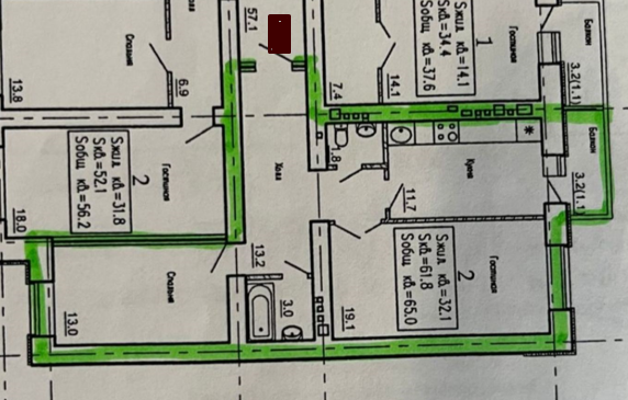 Жилая площадь 32.1 м2