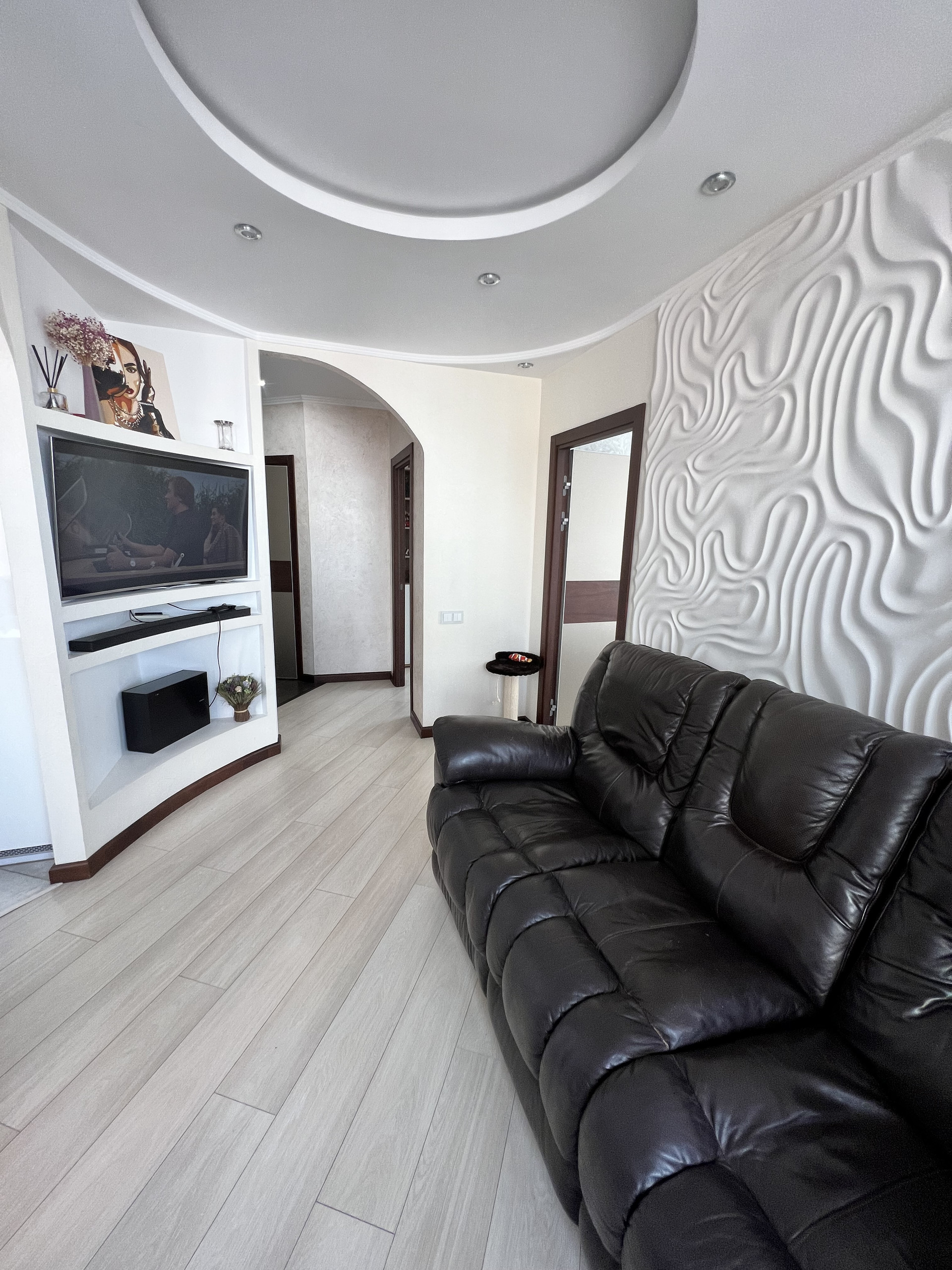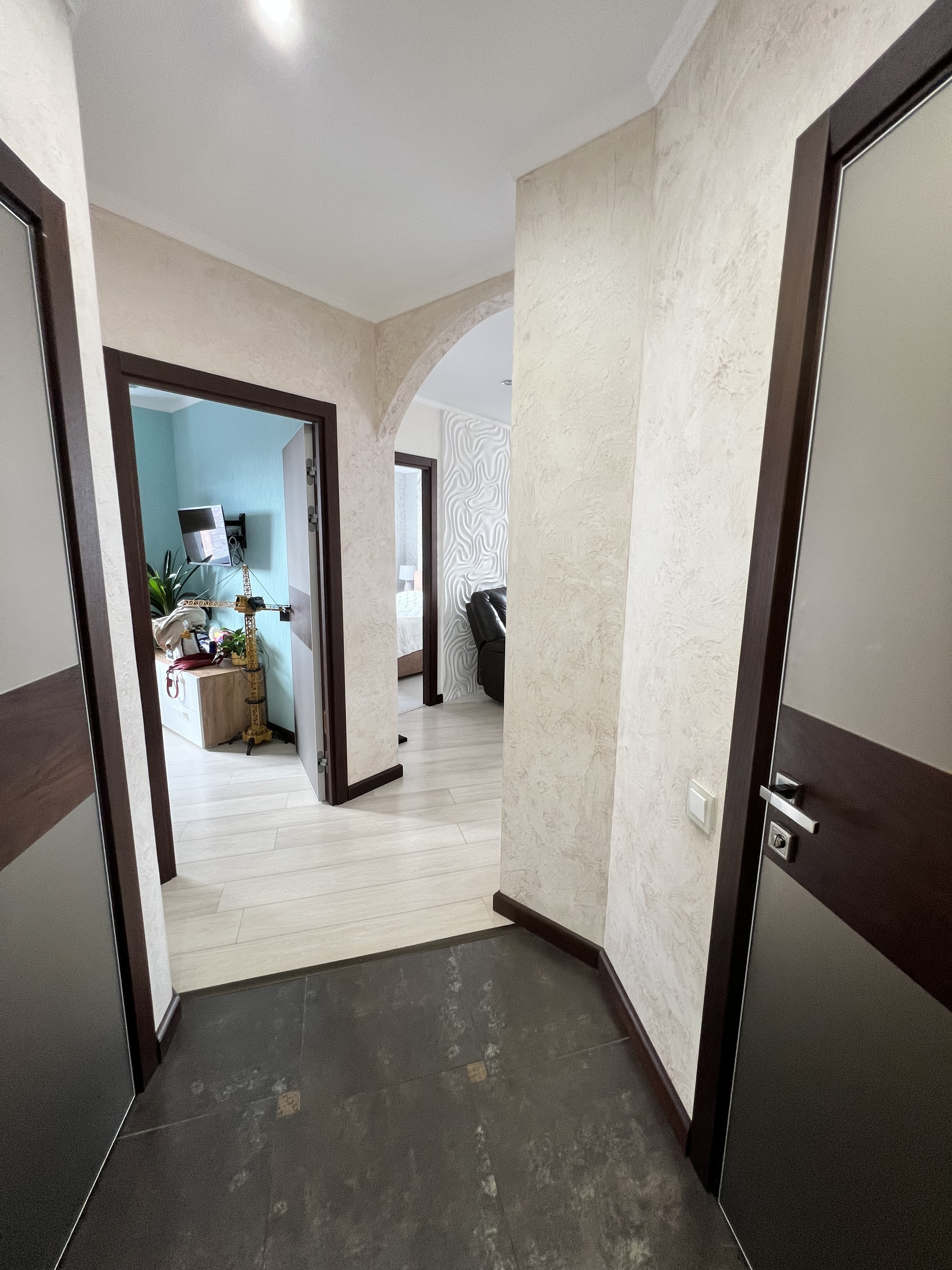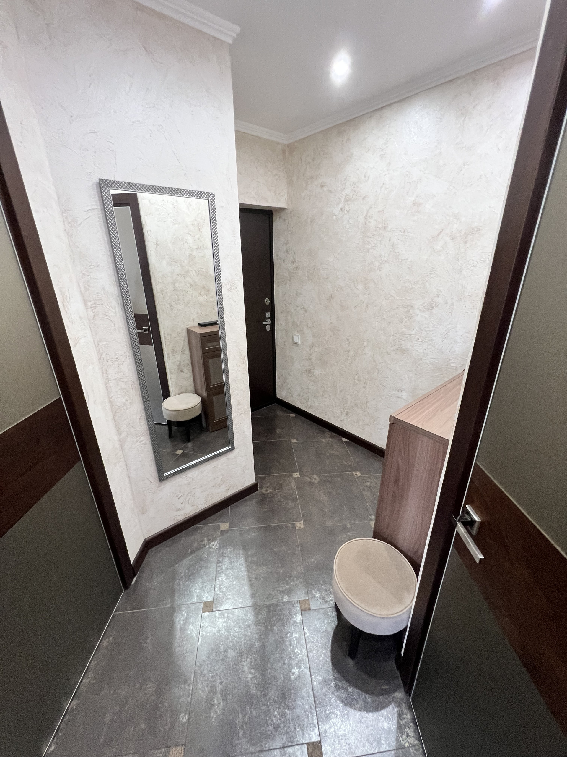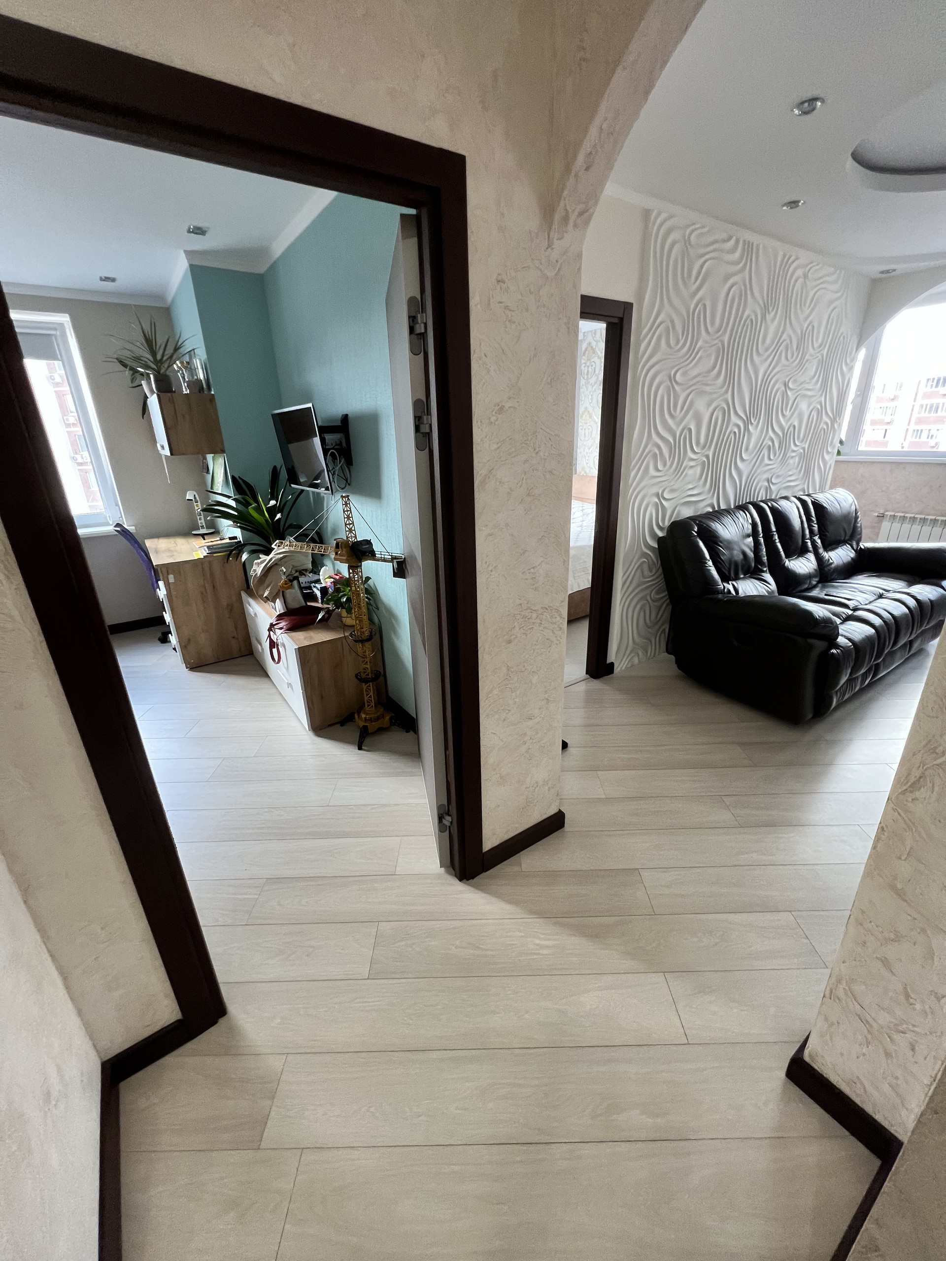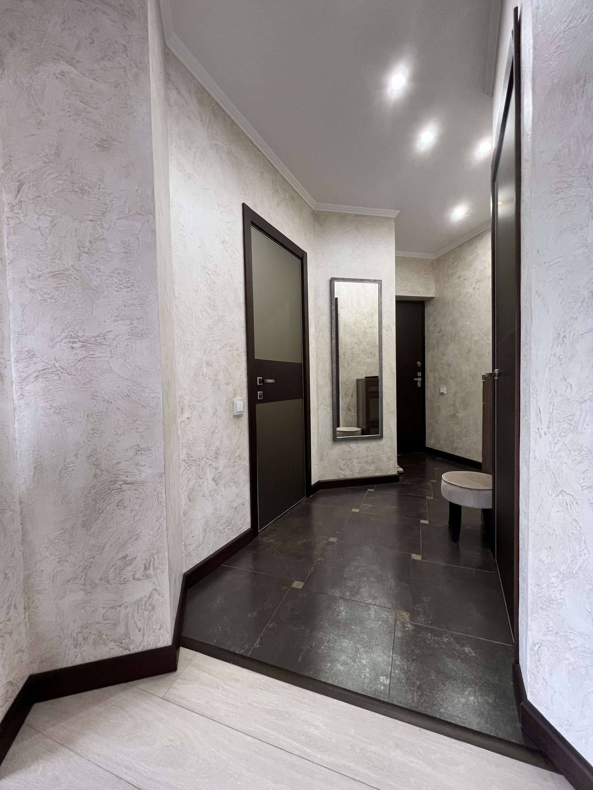 Отделка стен- венецианская штукатурка, напольное покрытие- итальянская плитка, ламинат, теплый пол, многоуровневое освещение. Высота потолков и площадь создают пространство и объем.