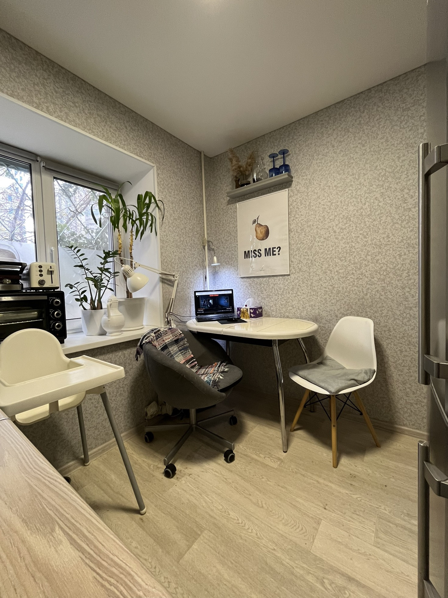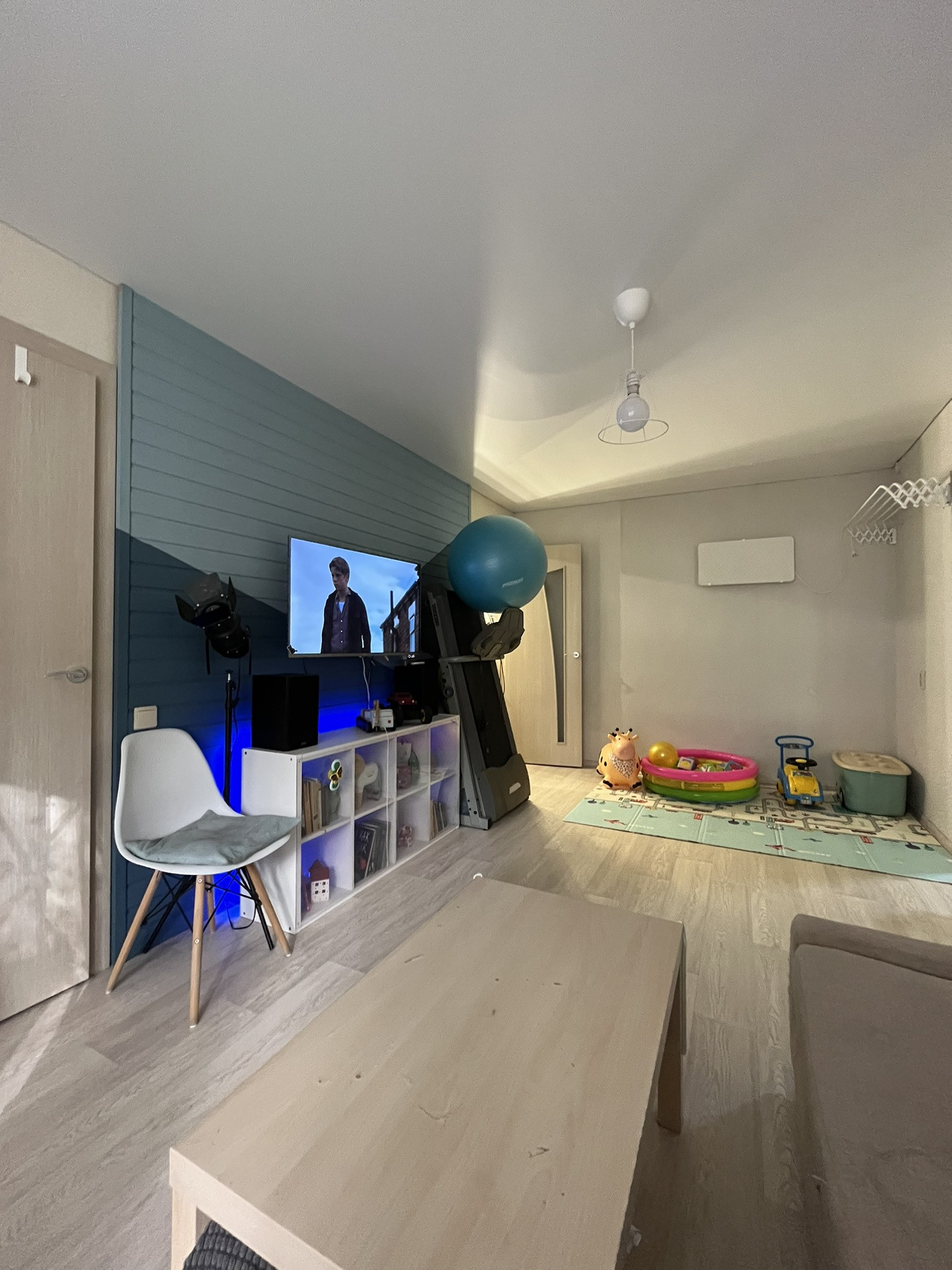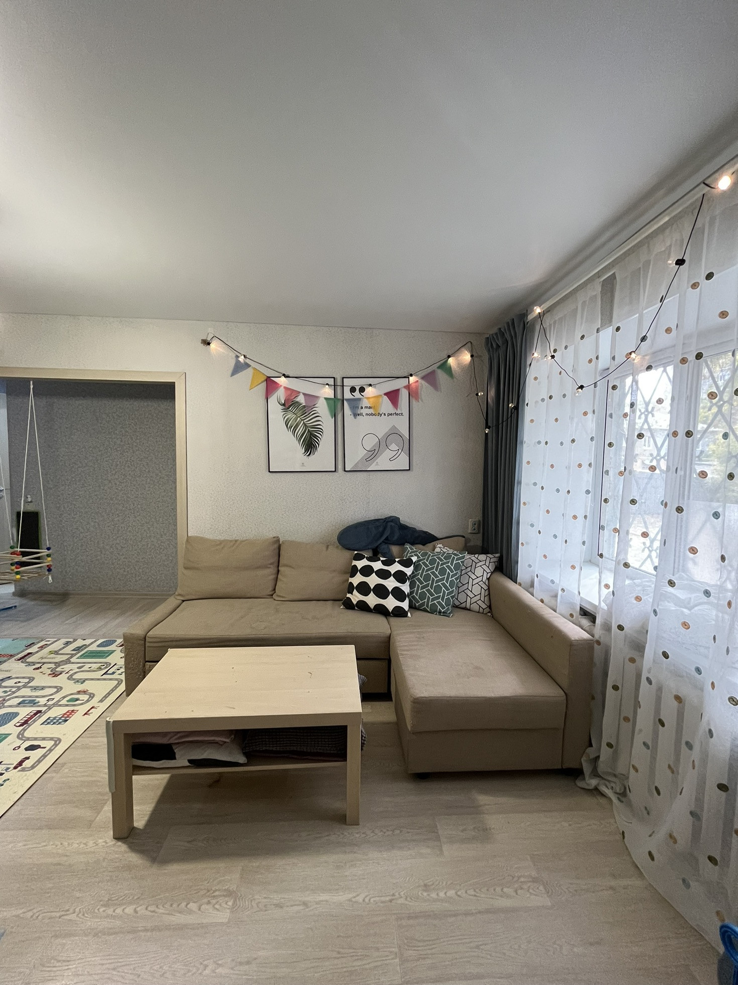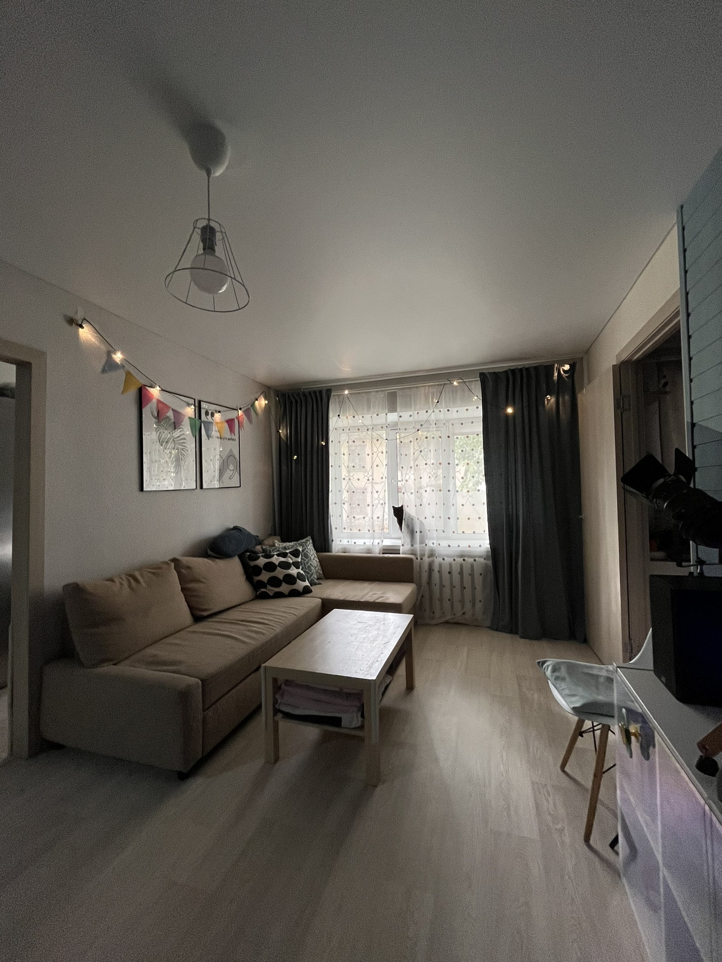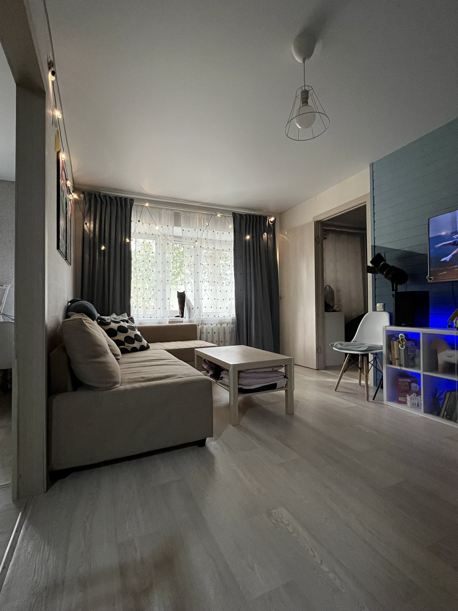 На окнах стеклопакеты, на полу линолеум, матовый натяжной потолок.