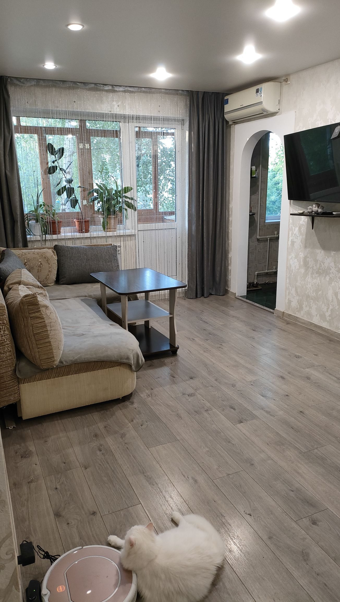 Новым собственникам остается встроенный кухонный гарнитур со встроенной техникой (газовая колонка и посудомоечная машина ВOSСН), газовая варочная панель и духовой шкаф, в спальной комнате большой функциональный шкаф купе, кондиционер в гостиной, большой стол в детской. Остальная техника и мебель по договоренности.