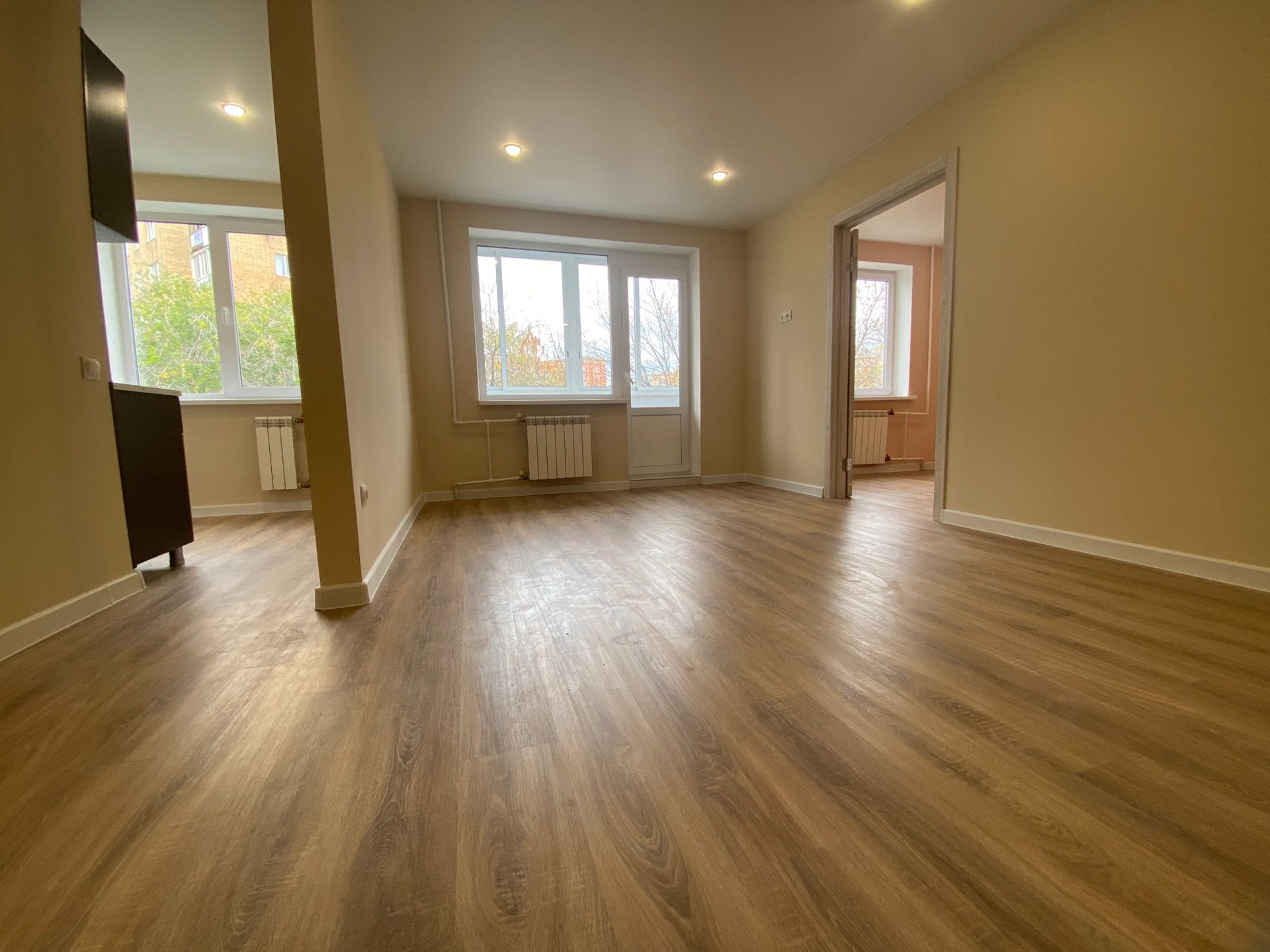 В квартире сделано абсолютно все-стяжка пола,новые трубы радиаторы и сантехника,электрика,окна,балкон! Стены выровнены,покраска,санузел в плитке,балкон застеклен и утеплен.