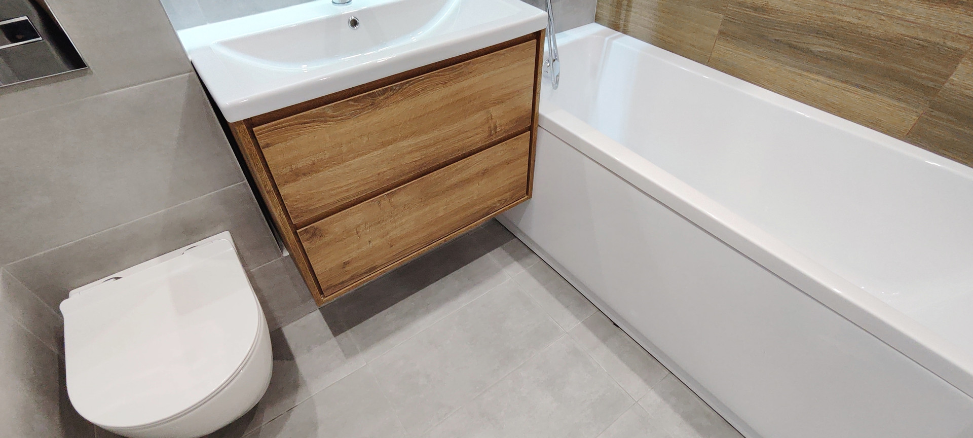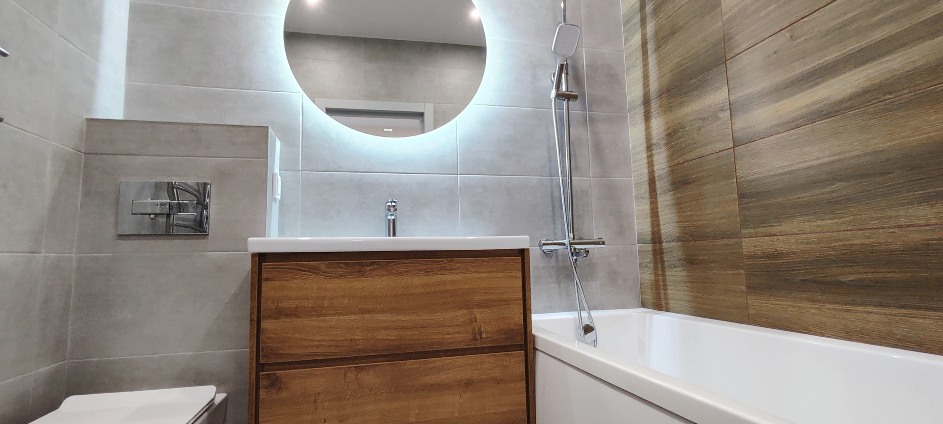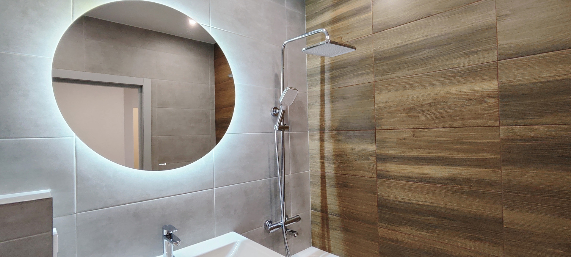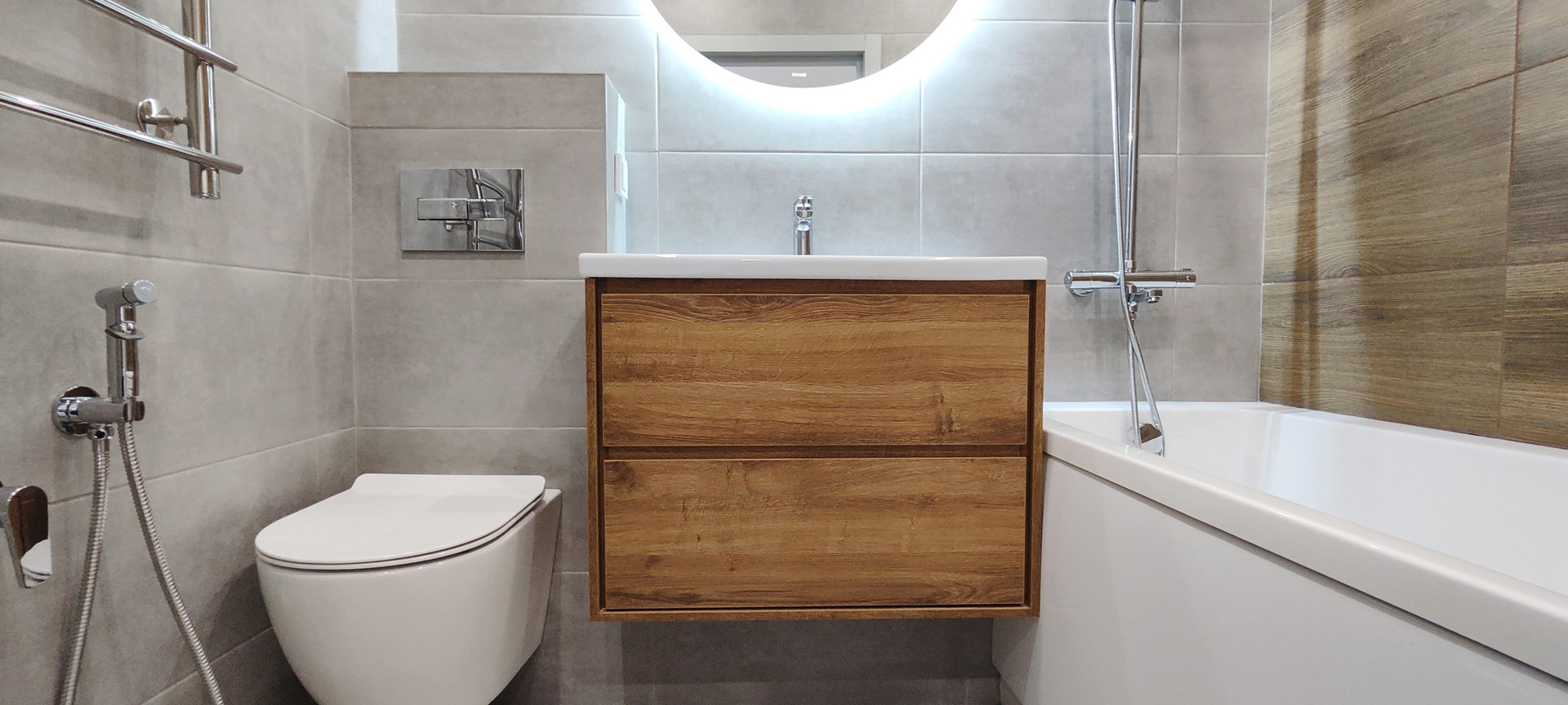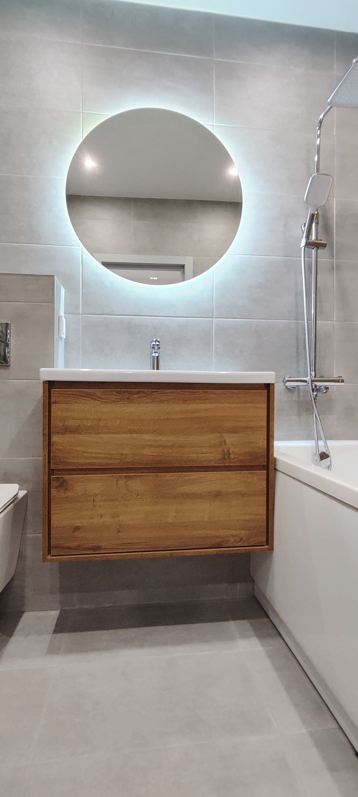 ✔️ пол и стены в санузле керамогранит, установлено зеркало с сенсорной подсветкой и тумбой;