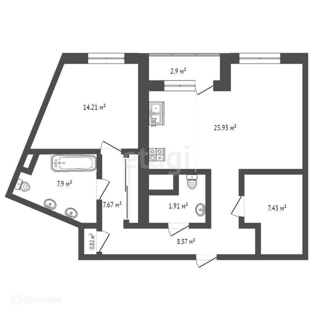 Общая площадь — 74.4 м2. Большая кухня-гостинная 26м2 с выходом на лоджию.