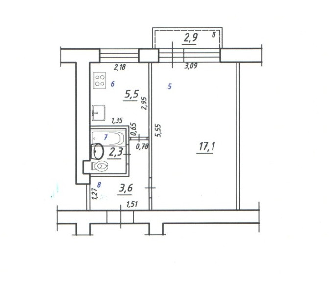 Комнатa 17,1 кв.м., кухня 5,5 кв.м., с/у совмeщённый, бaлкон зacтеклён.