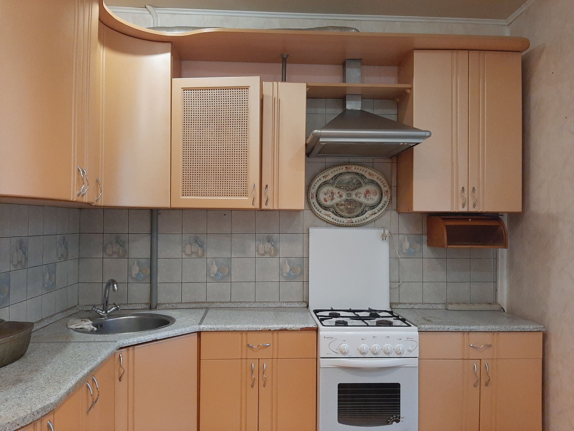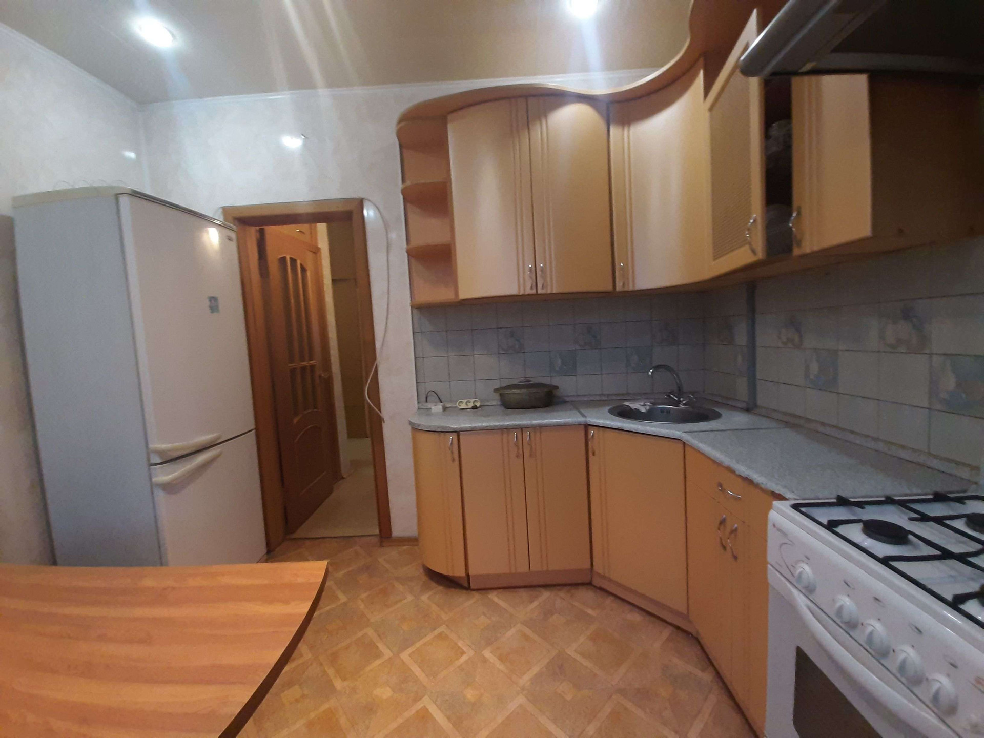 Кухня квадратная, большая, с встроенным кухонным гарнитуром, стол, кухонный уголок, табуретки. Рядом с кухней есть встроенная кладовочка, которую можно использовать по назначению, либо убрав её увеличить площадь и без того большой кухни.