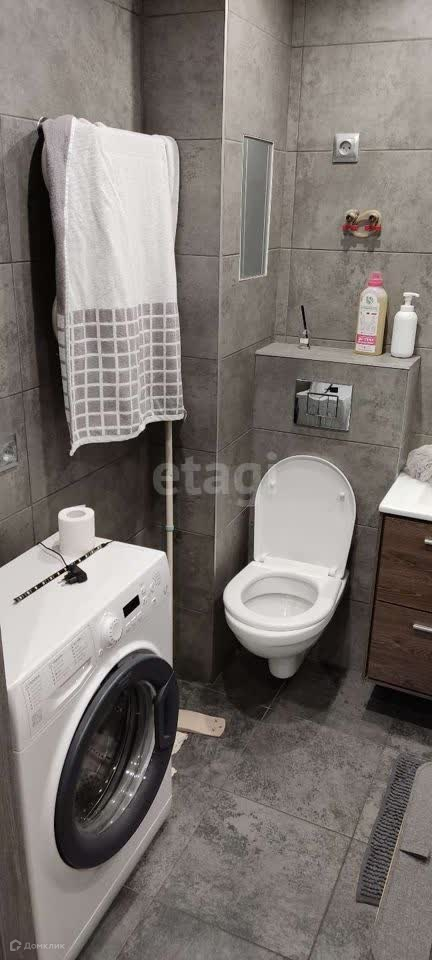 Санузел совмещённый,есть стиральная машина и мебель. В комнате также все обставленно.В прихожей встроенный шкаф купе.