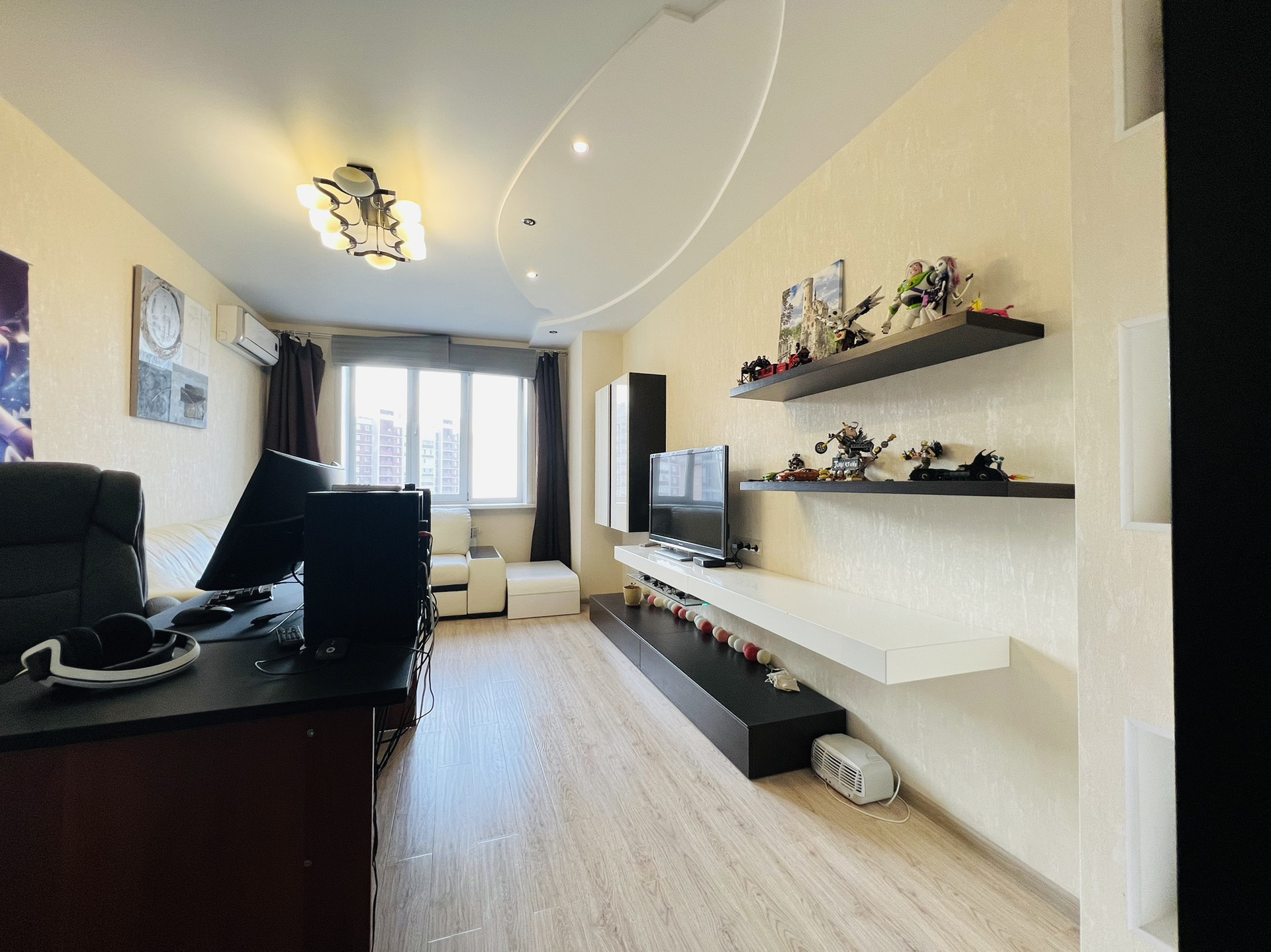 1 Квартира полностью готова для проживания, остаётся вся встроенная мебель и техника (кухня, посудомоечная машина, плита, вытяжка, микроволновка, духовка, холодильник, стиральная машинка) кондиционер, водонагреватель, все шкафы, большая кровать и диван).