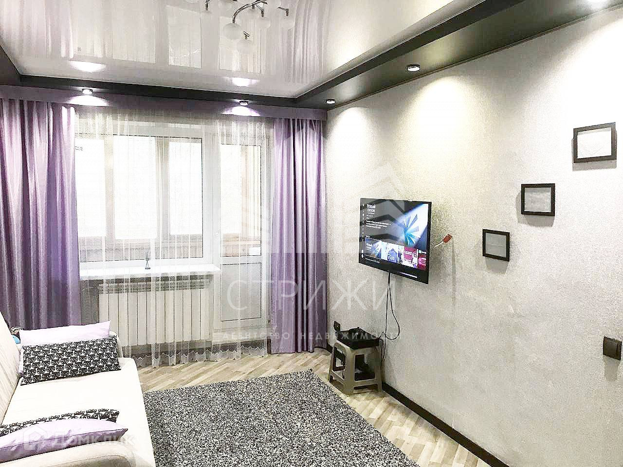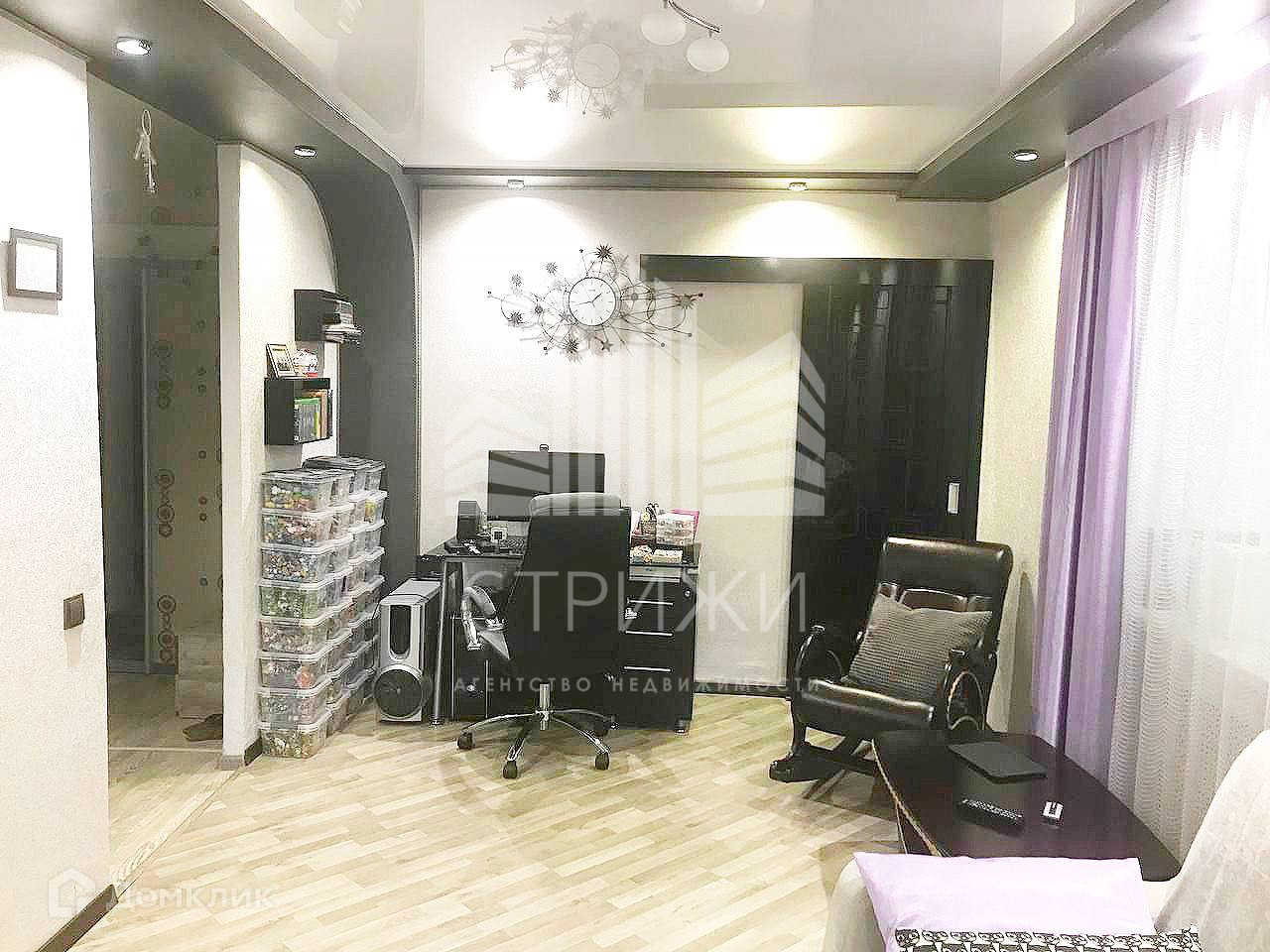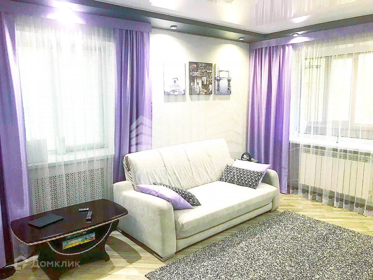 Установлены натяжные потолки, точечное освещение в комнате, пурпурные шторы у пластиковых окон. Постелен ламинат и линолеум.