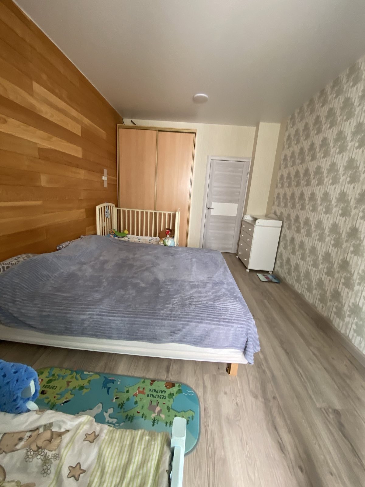В спальне стена отделана вагонкой из кедра.