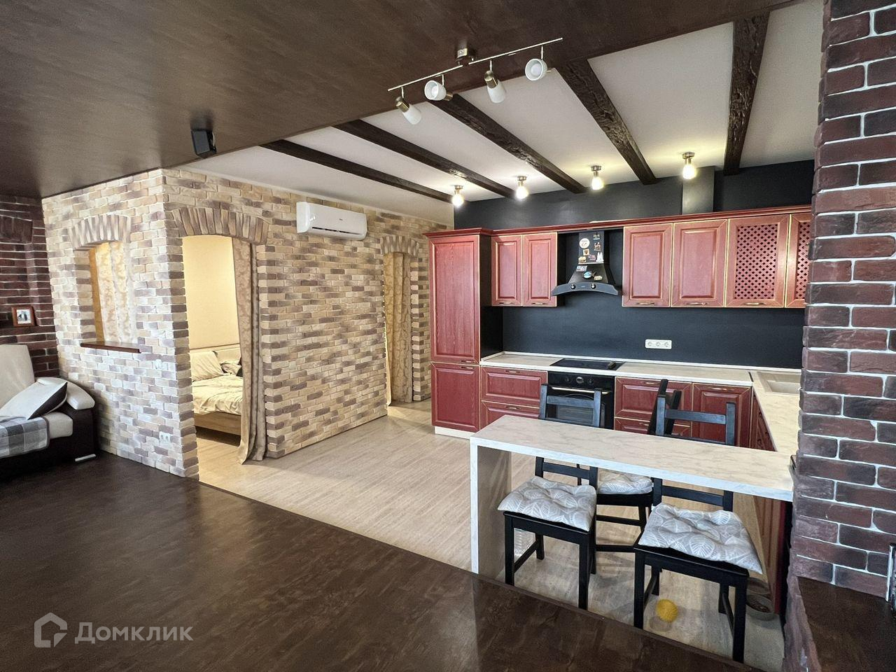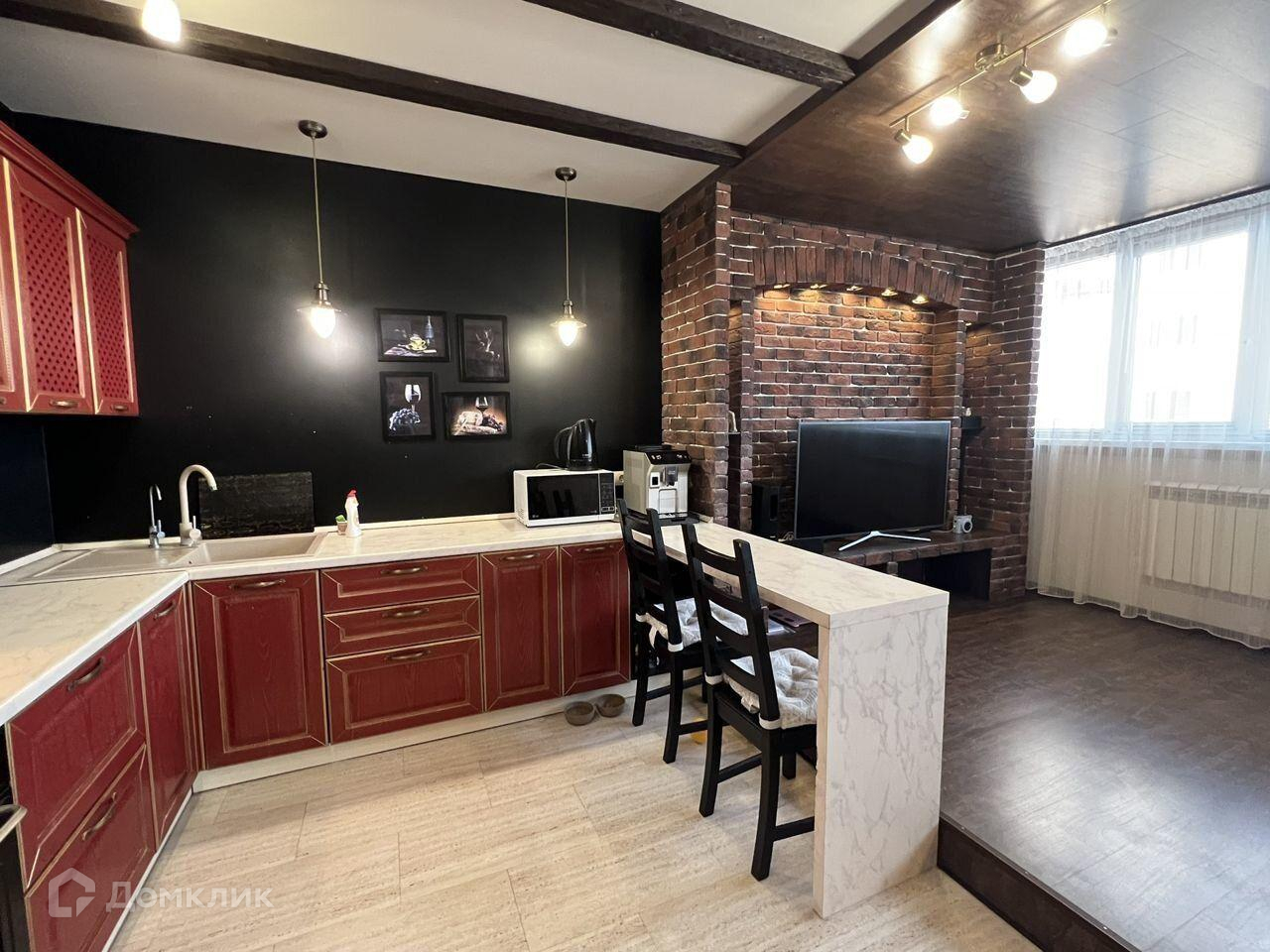 Кухня выполнена из натурального дерева красного цвета и оборудована всей необходимой встроенной техникой. Окна квартиры выходят на город и открывают отличный вид, особенно на ночное освещение города.