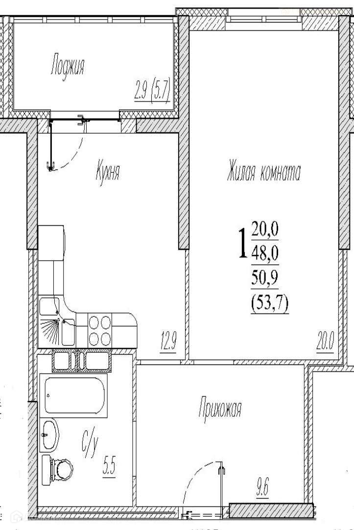 В квартире отличная планировка: просторная комната 20 кв.м., большая светлая кухня 13 кв.м. с выходом на лоджию с панорамным остеклением, прихожая 9,6 кв.м. с местом под гардеробную и совмещённый санузел 5,5 кв.м.