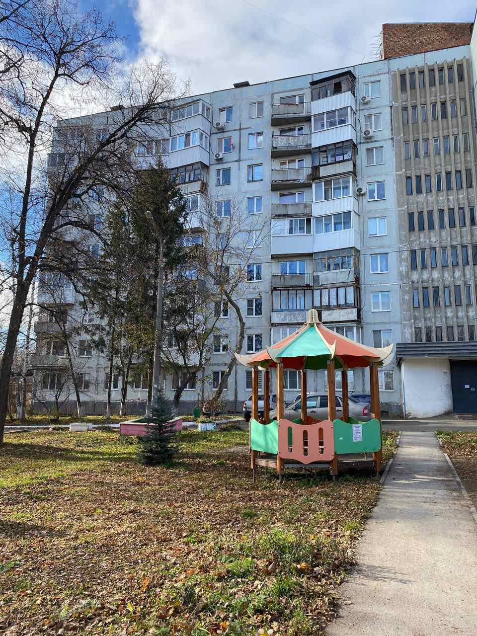 Большая благоустроенная территория двора с современной детской площадкой, дорога отремонтирована.