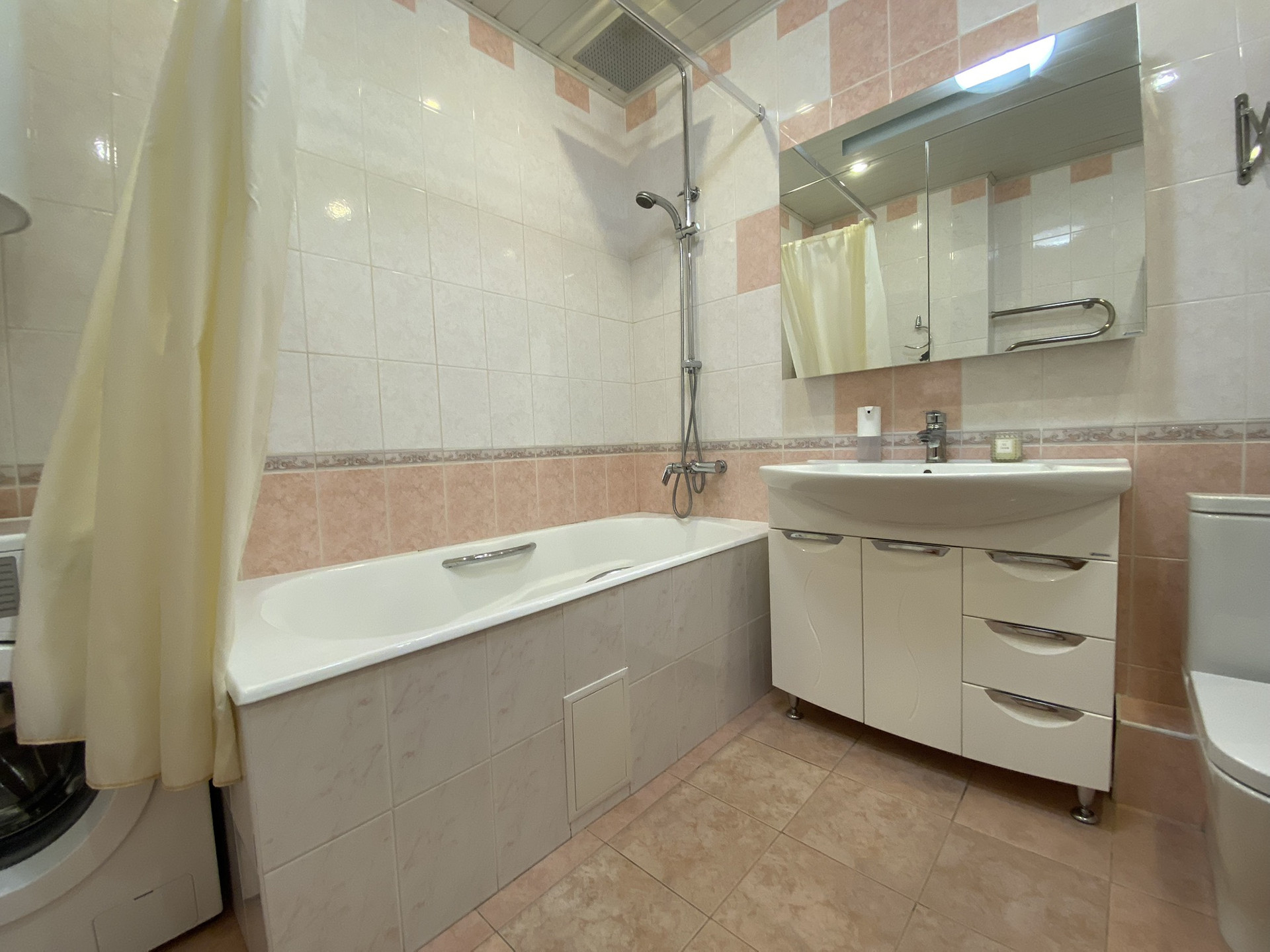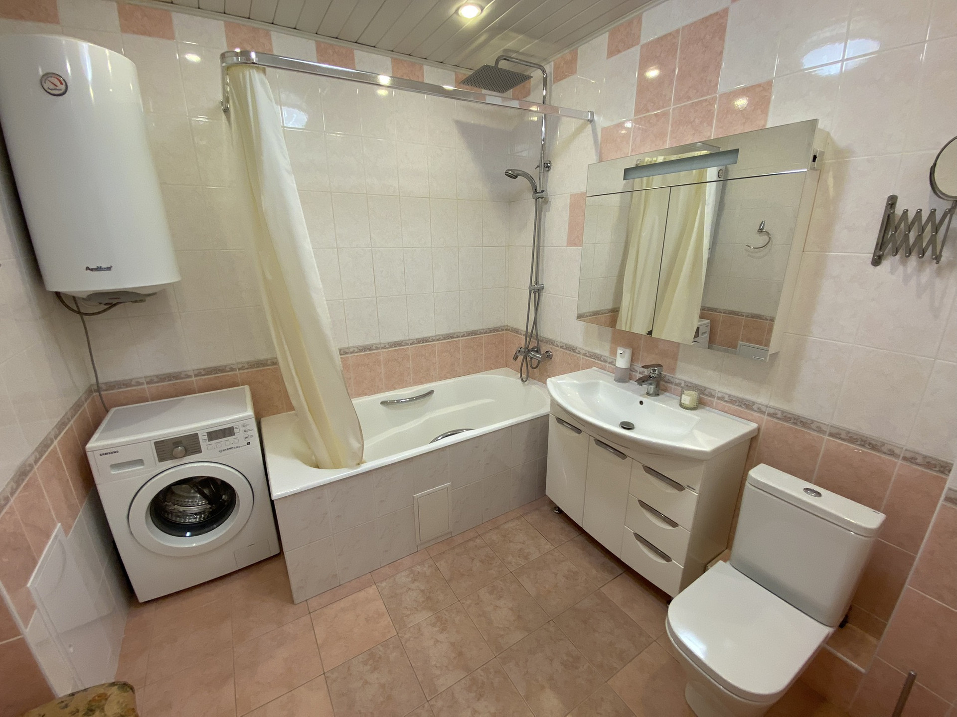Первый санузел - 7 кв.м, установлен водонагреватель на 100 литров, ванная, стиральная машинка, раковина.