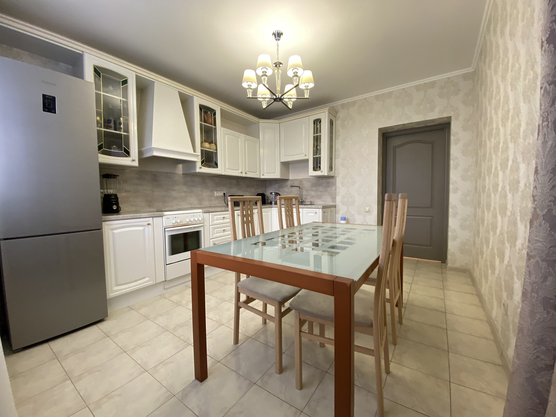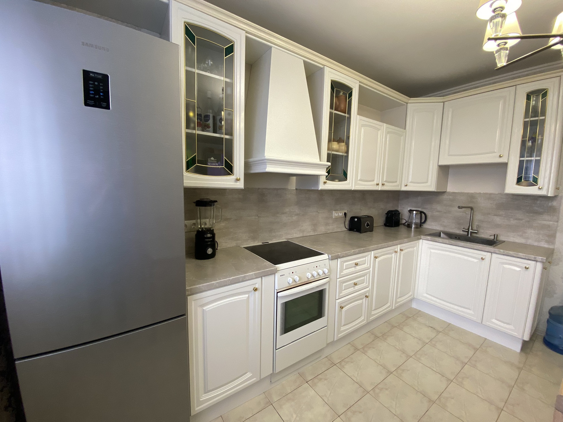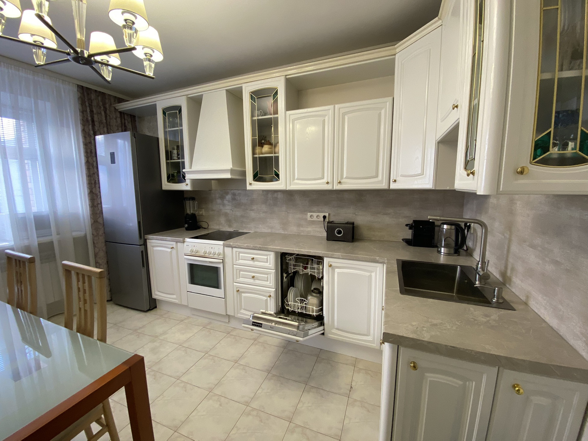 Кухня фабрики "Мария", со встроенной техникой: вытяжка, посудомоечная машина, фильтр для воды. Из кухни выход на утепленный балкон.