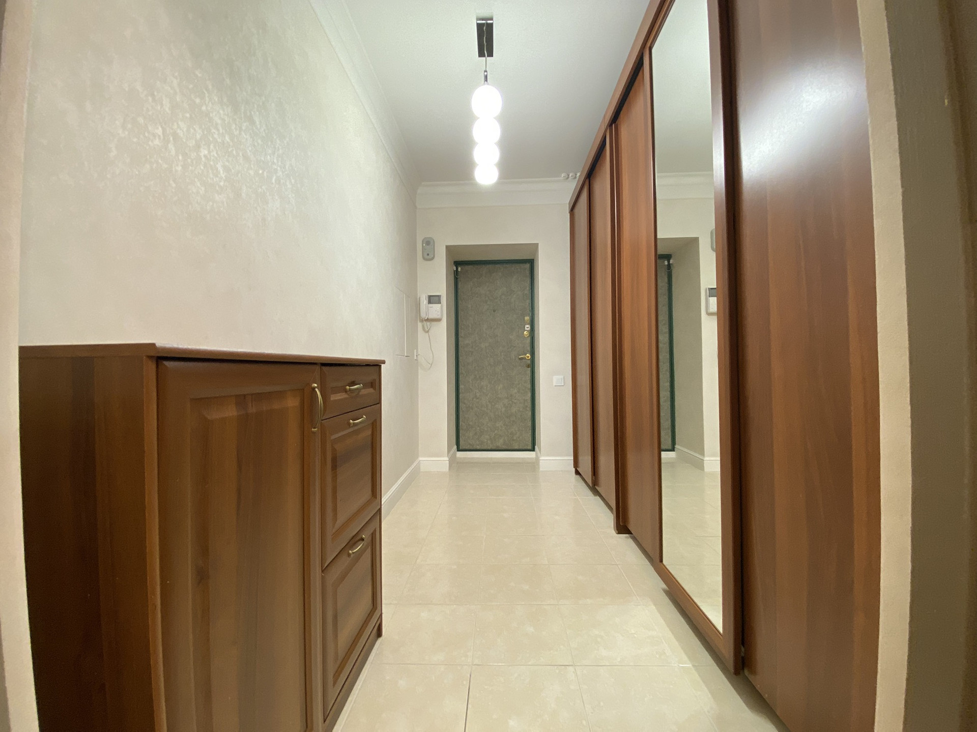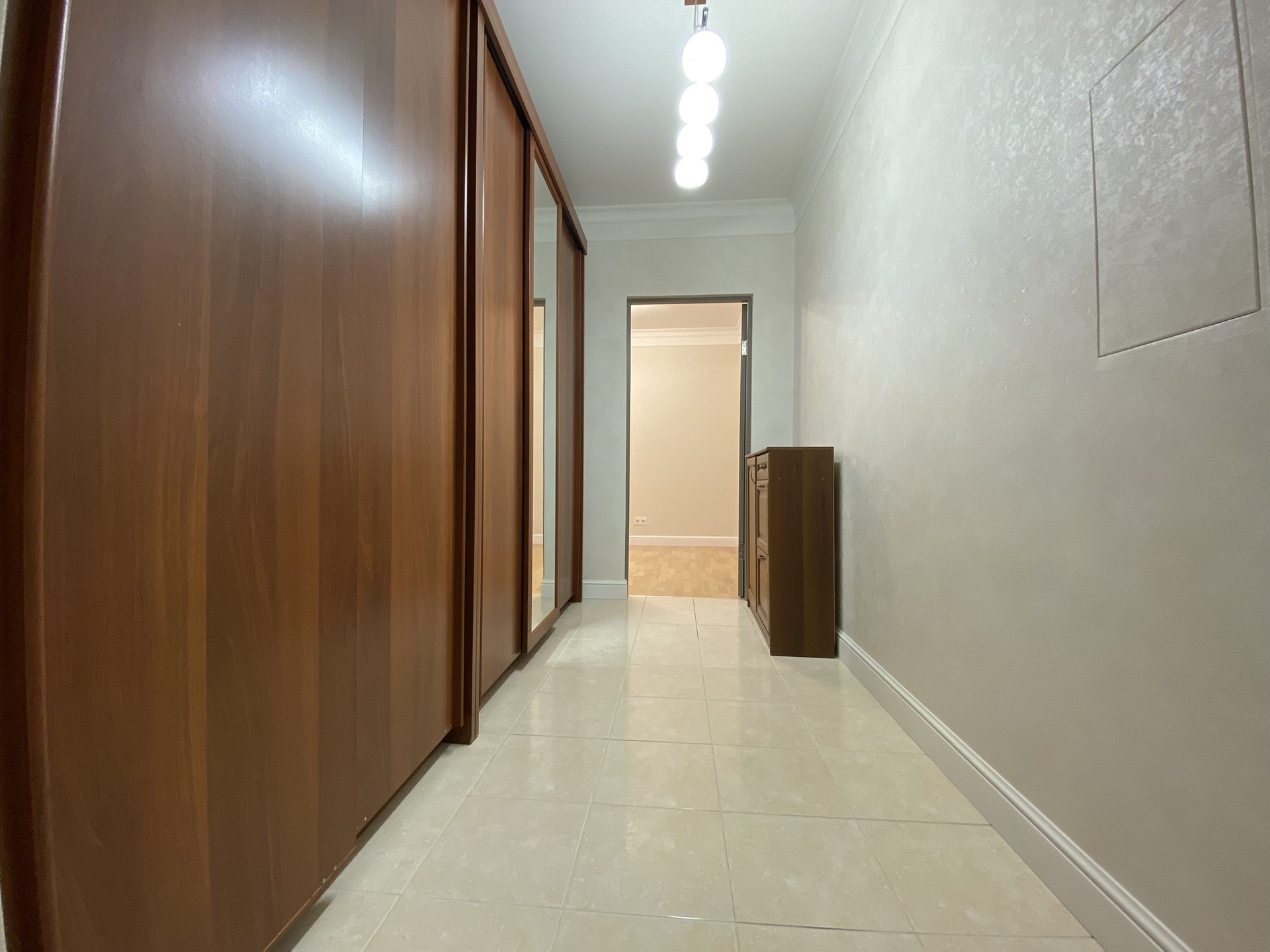 Просторная прихожая с зеркальными гардеробными шкафами-купе, где много места для хранения вещей;