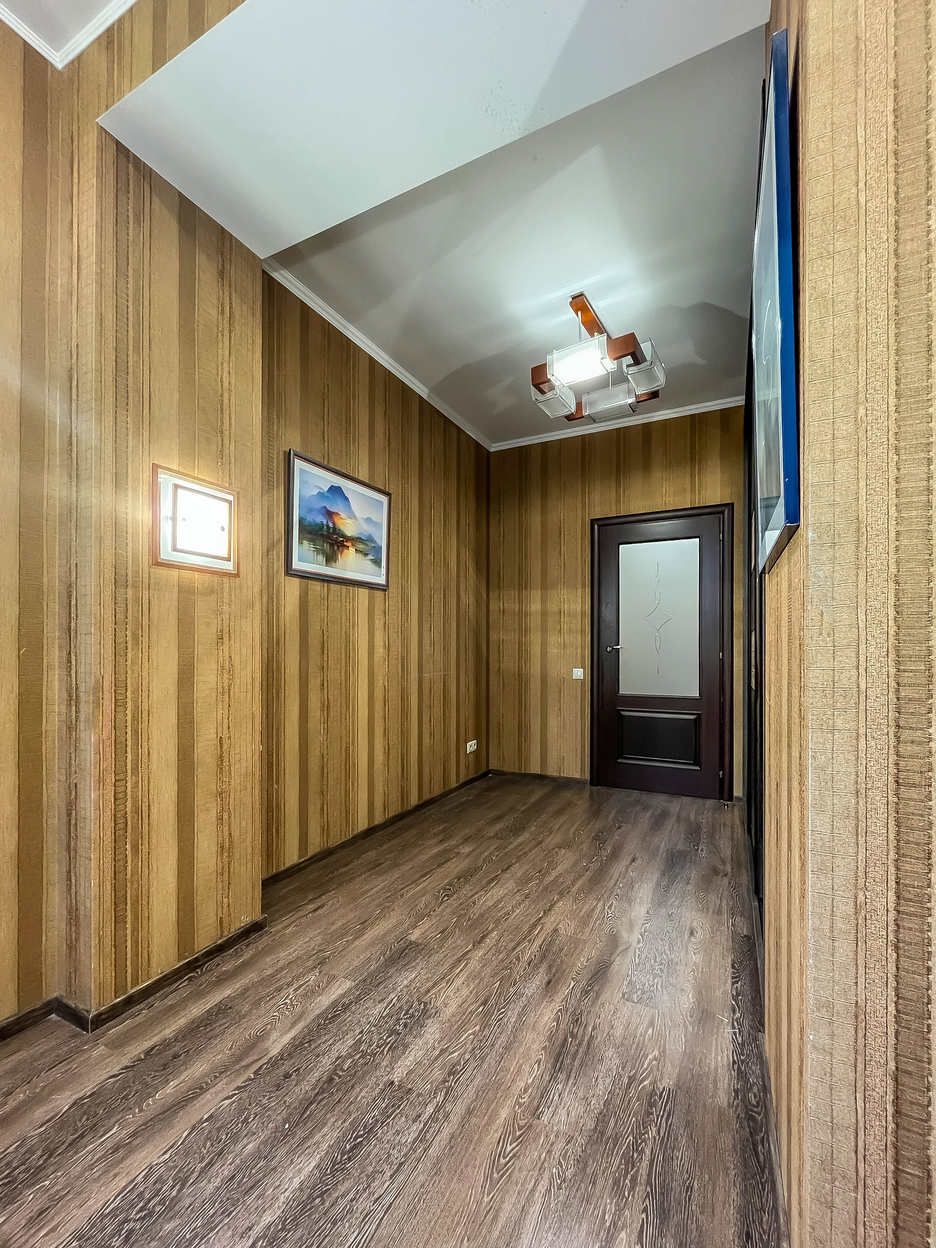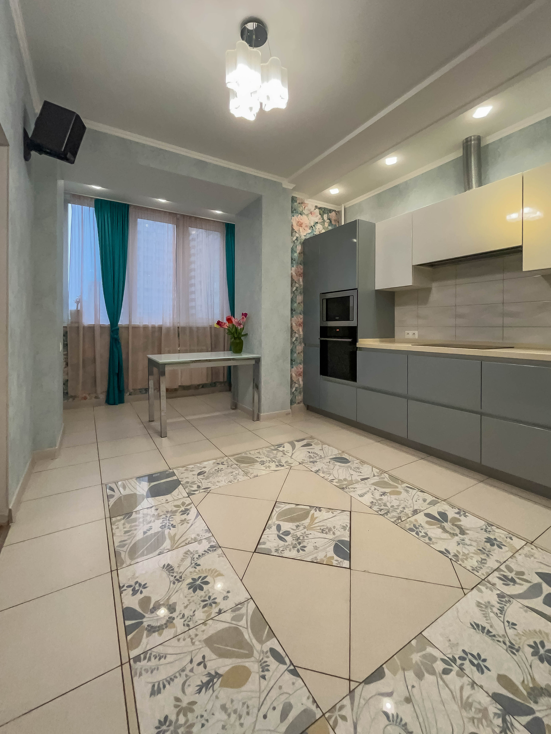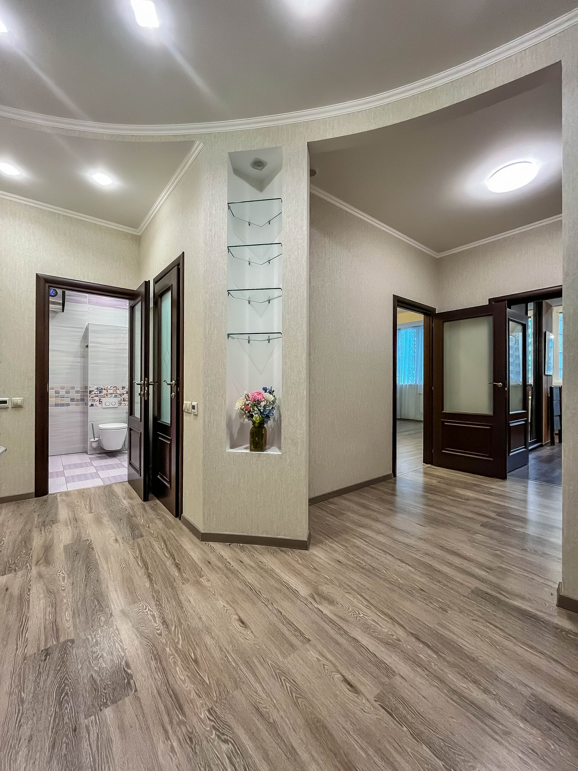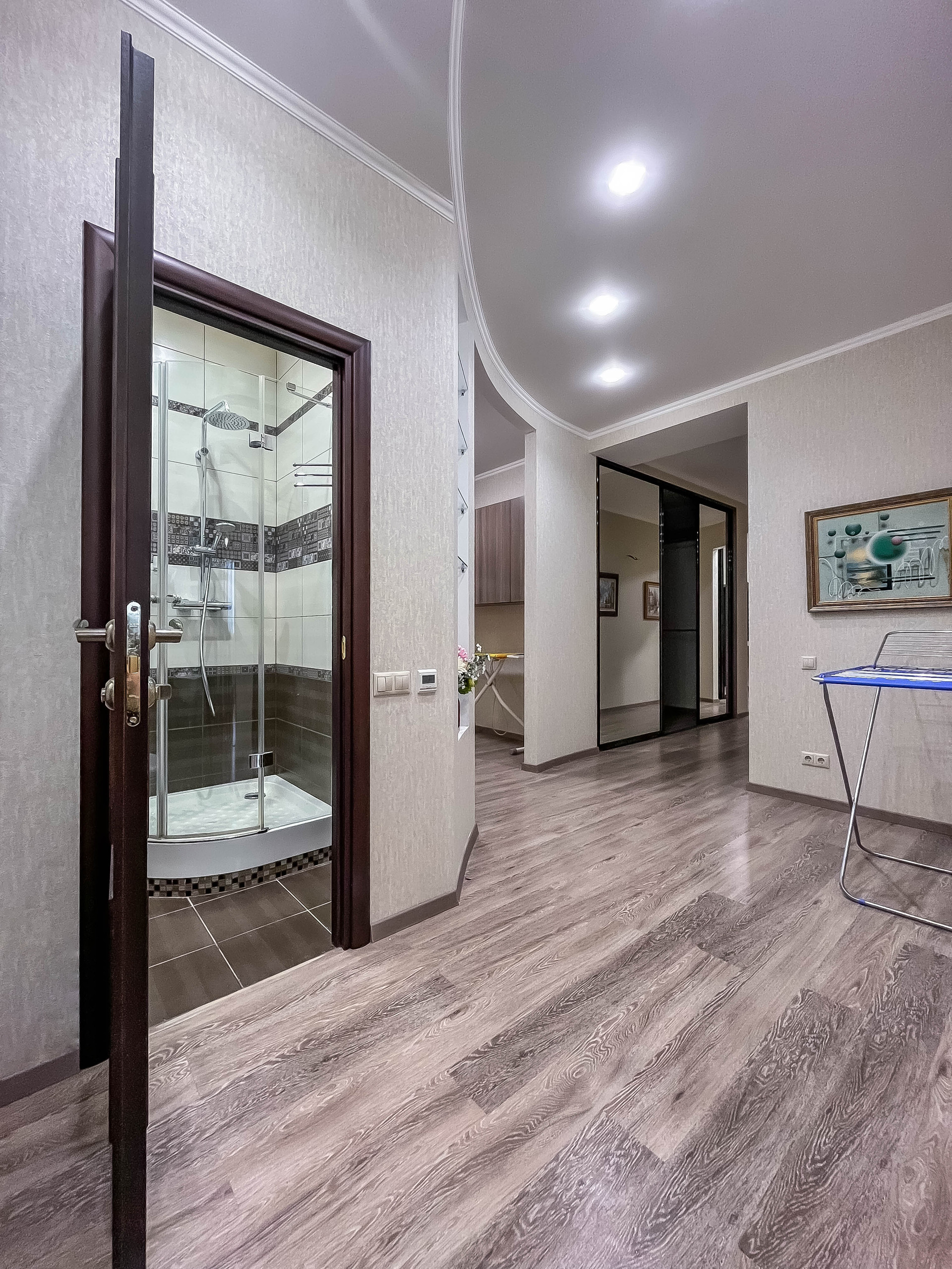 ✓ Полы ламинат (+пробка 3мм) или премиум плитка. Потолки многоуровневые ГКЛ или натяжные.