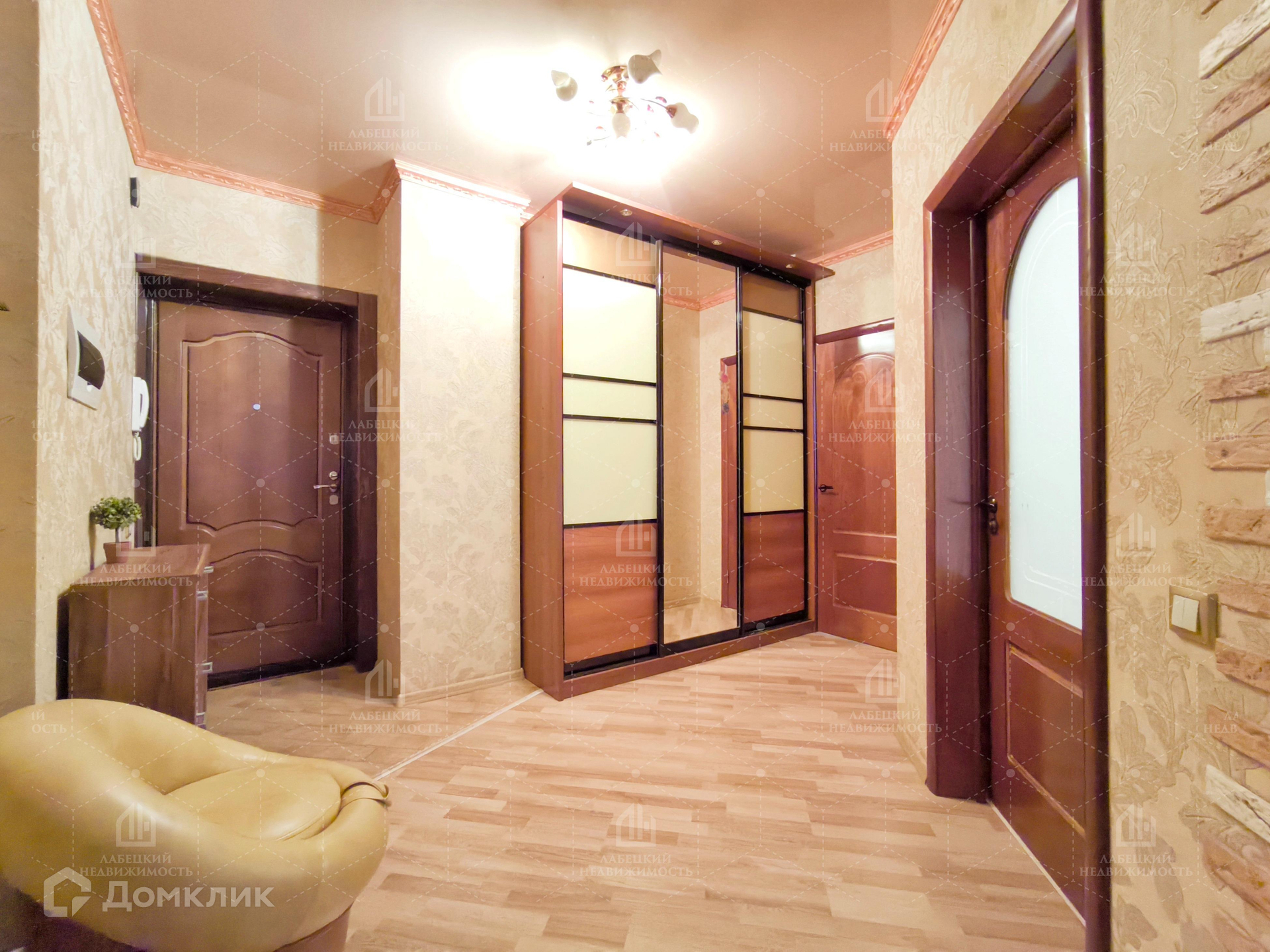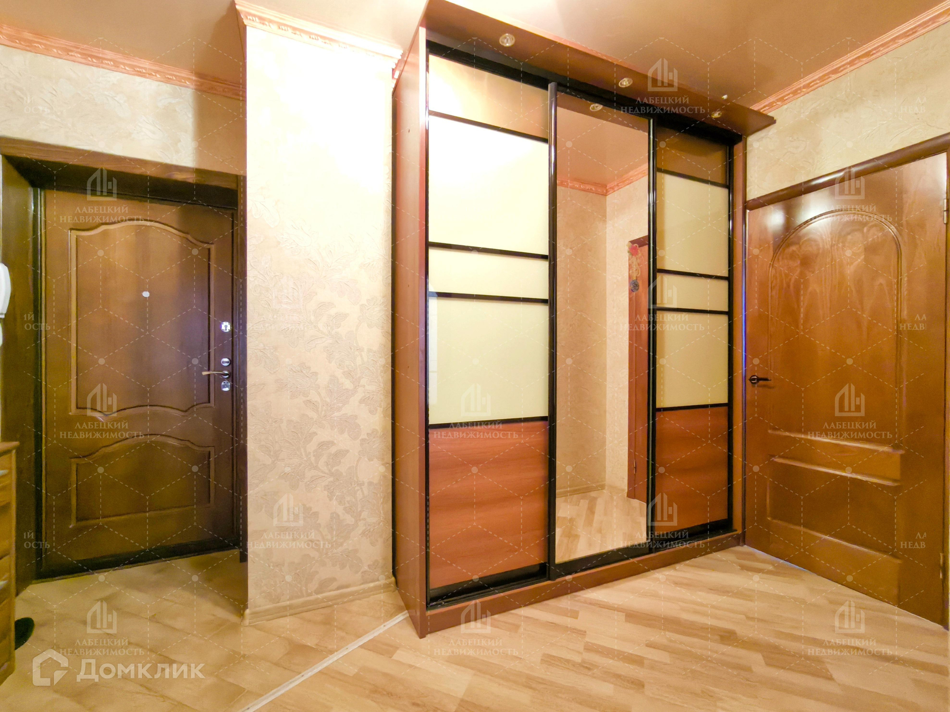 ФУНКЦИОНАЛЬНАЯ прихожая правильной формы. Установлен вместительный шкаф-купе с зеркальными дверями.