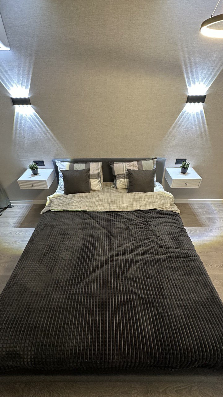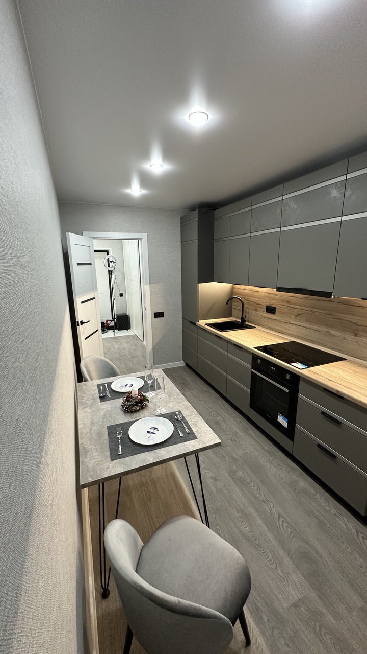 С высоты 16 этажа открывается завораживающий вид на город. В квартире установлена кухня DaVita с гарантией 8 лет, кровать с подъемным механизмом и большим местом для хранения.