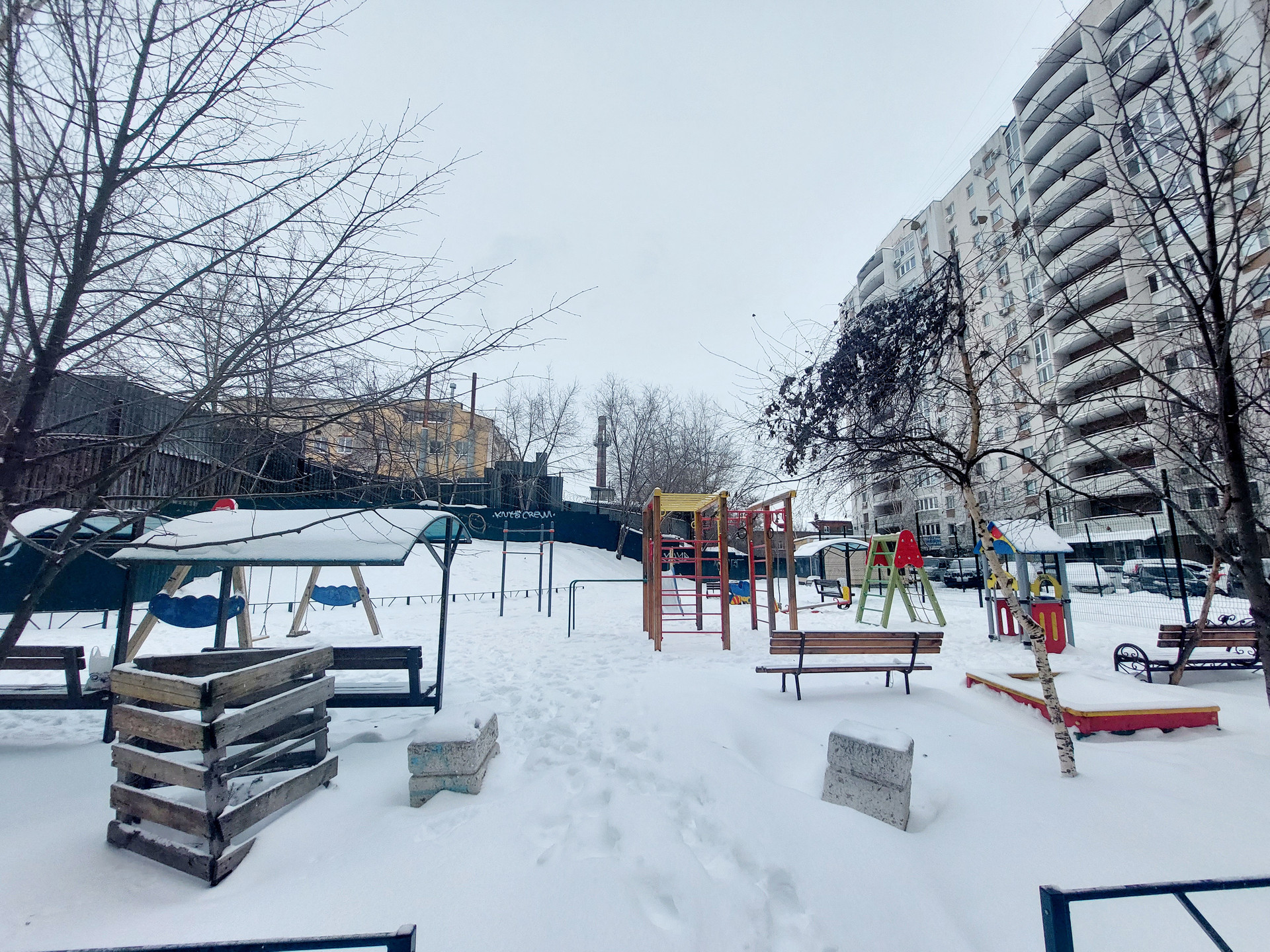 Во дворе имеются детская игровая и спортивная площадки.