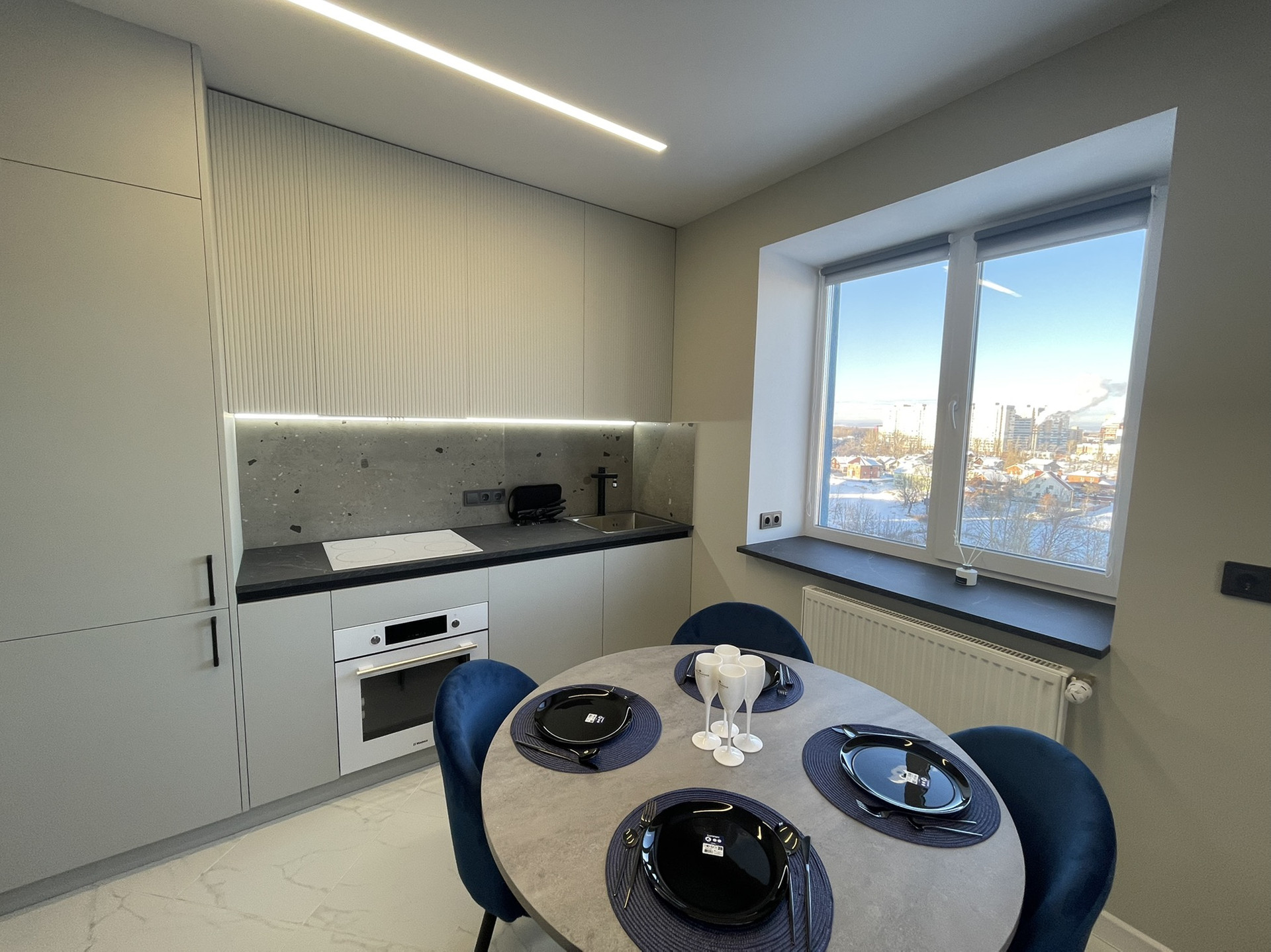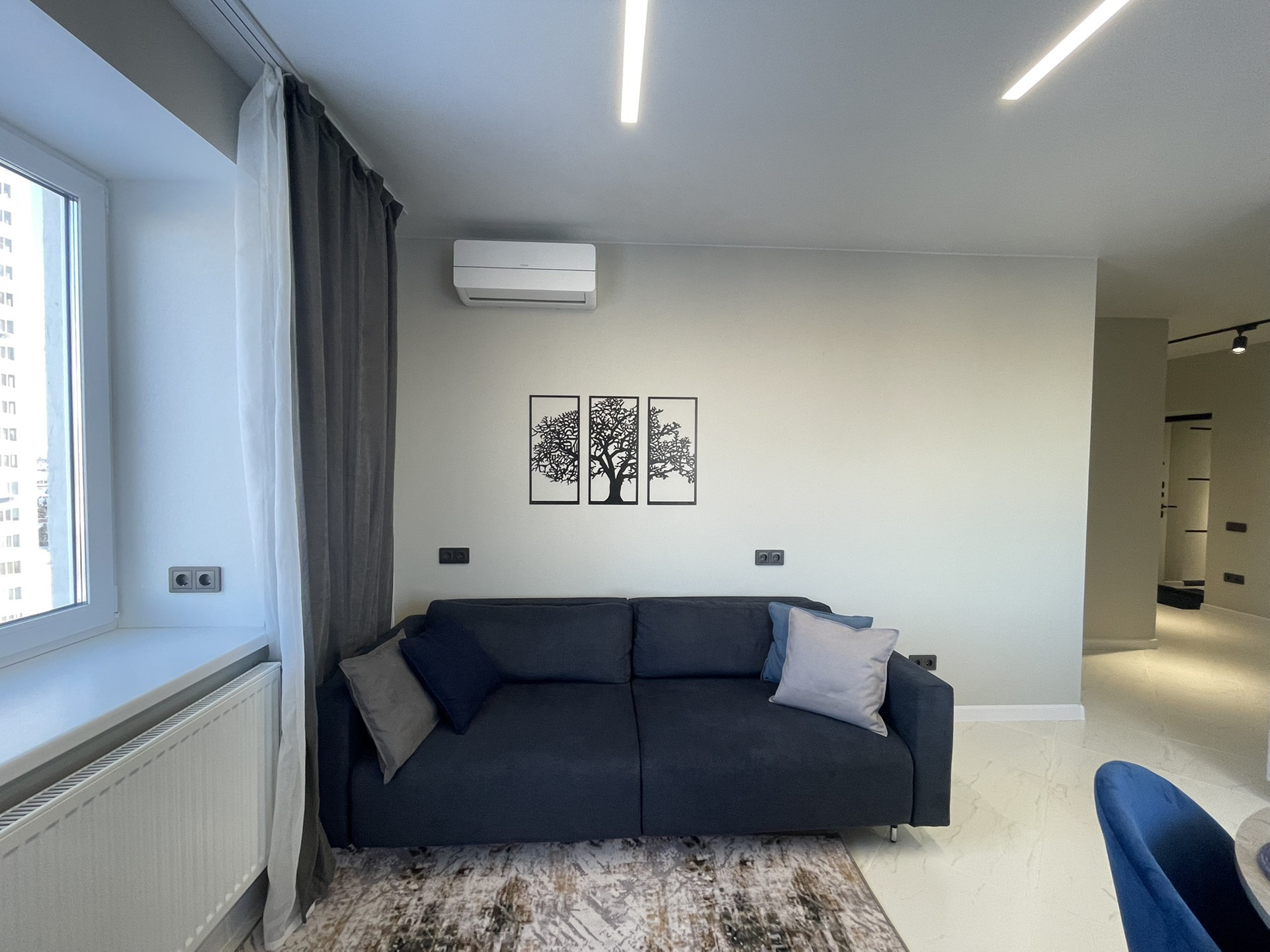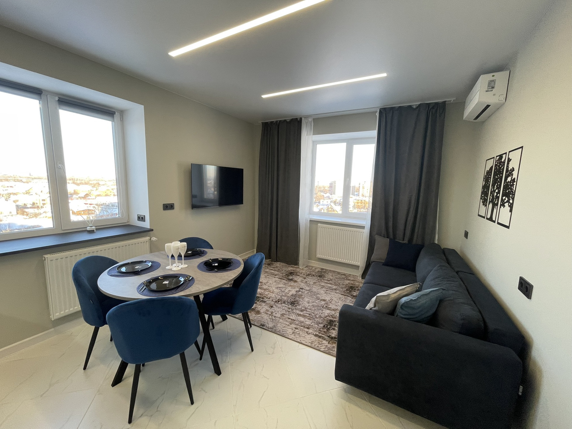 Хорошая система освещения потолка с дорогими блоками подсветки, которые не перегорают как это часто бывает, когда квартиру делают для продажи