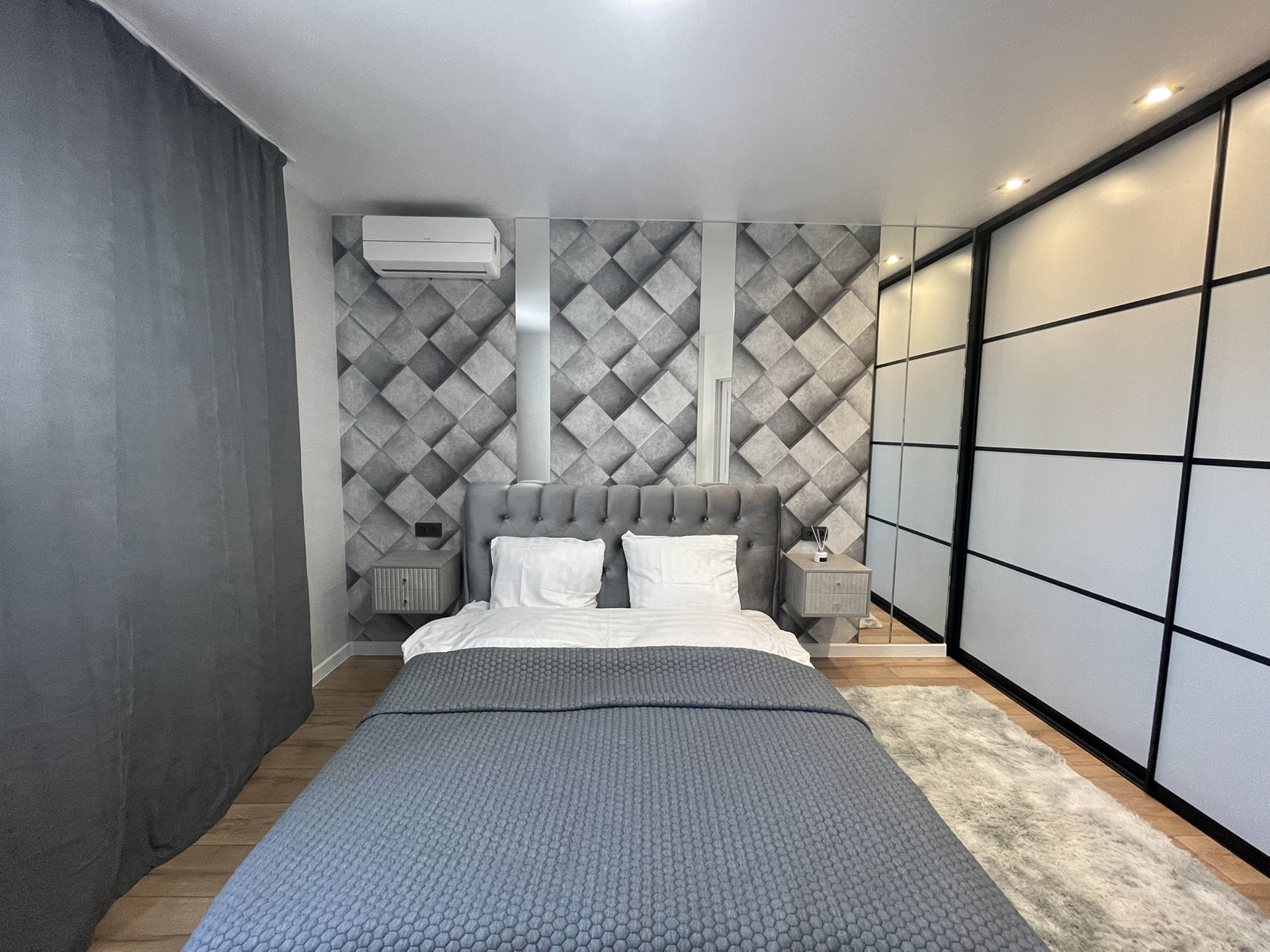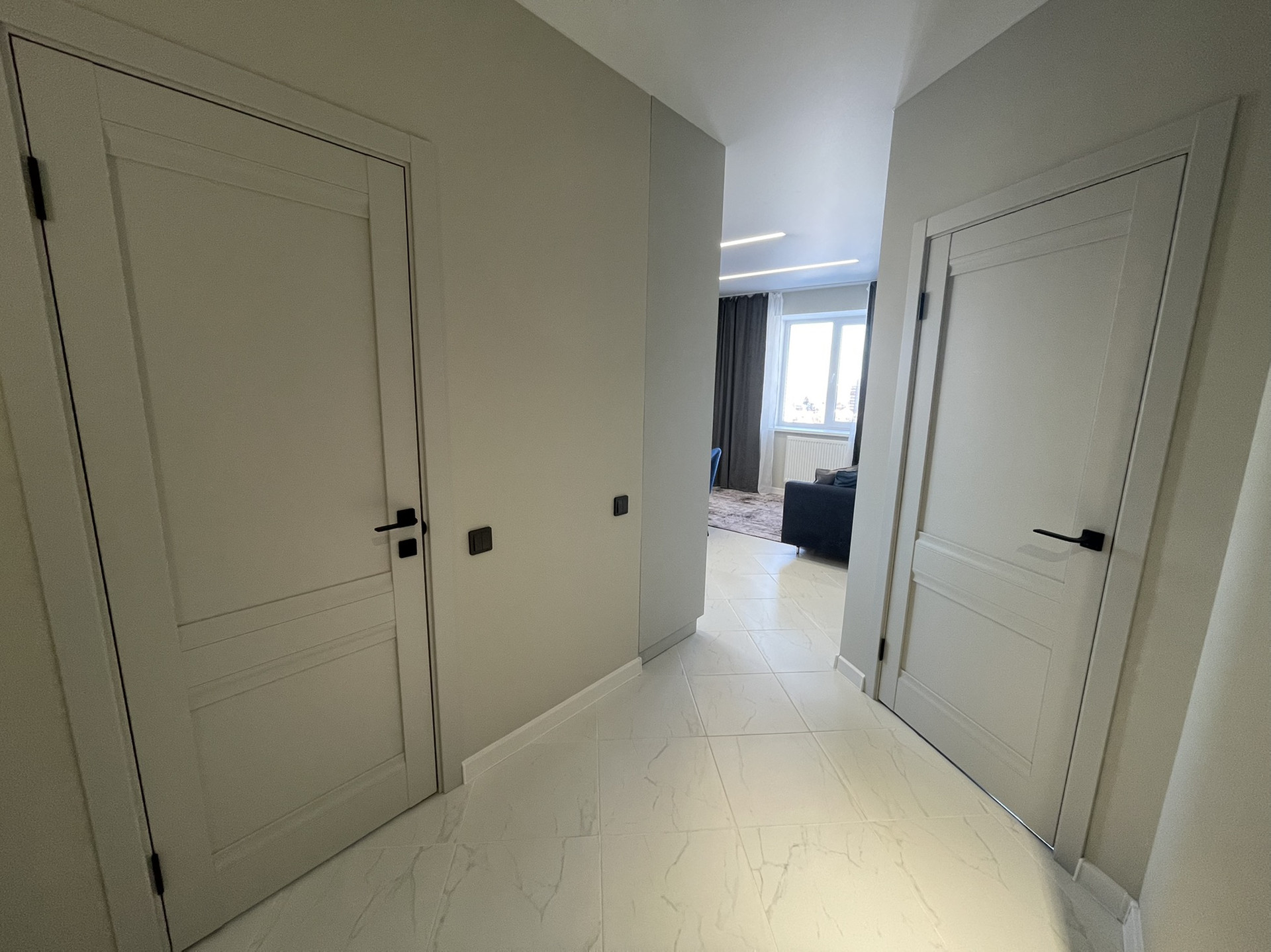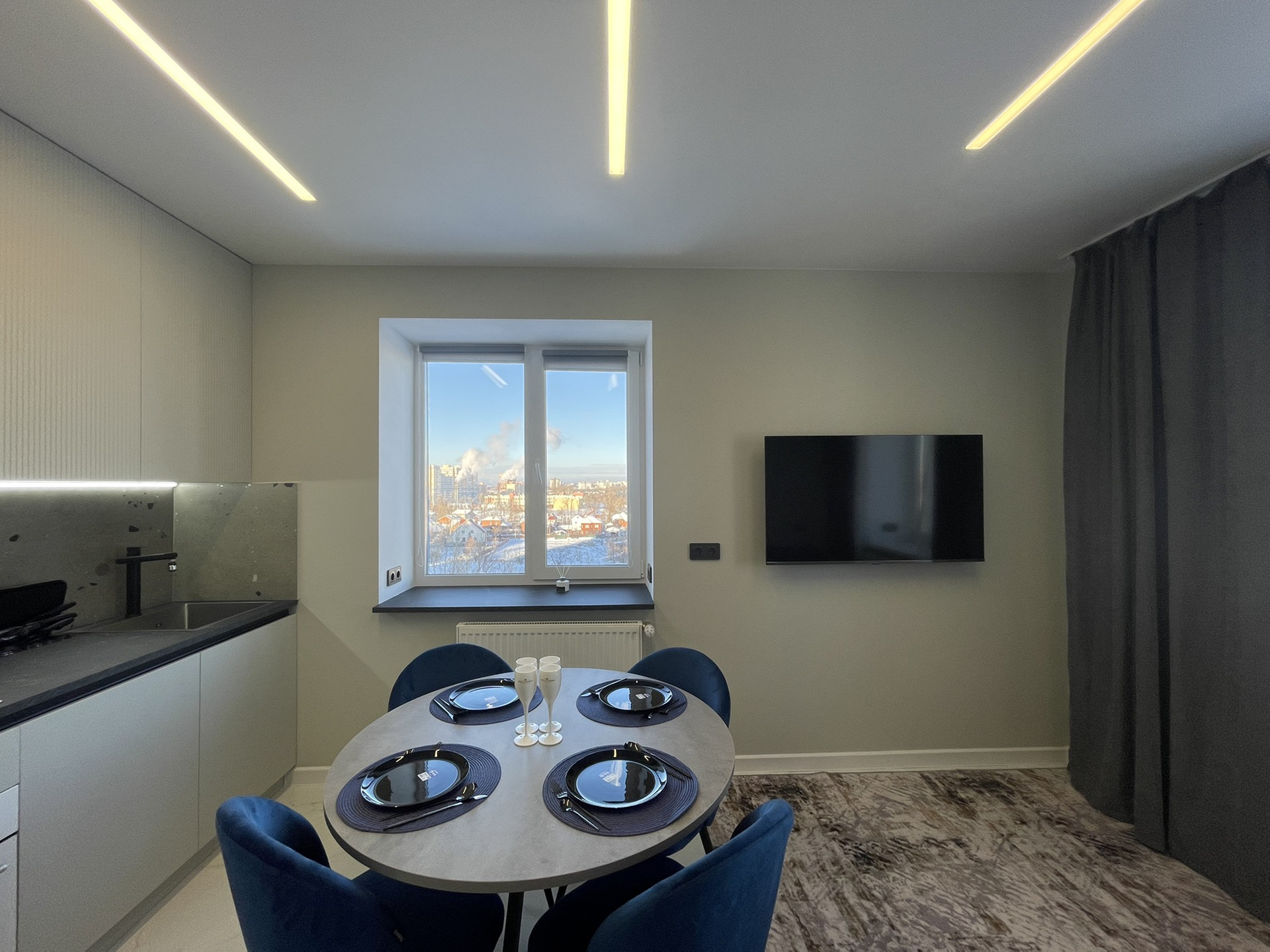 Хорошая система освещения потолка с дорогими блоками подсветки, которые не перегорают как это часто бывает, когда квартиру делают для продажи