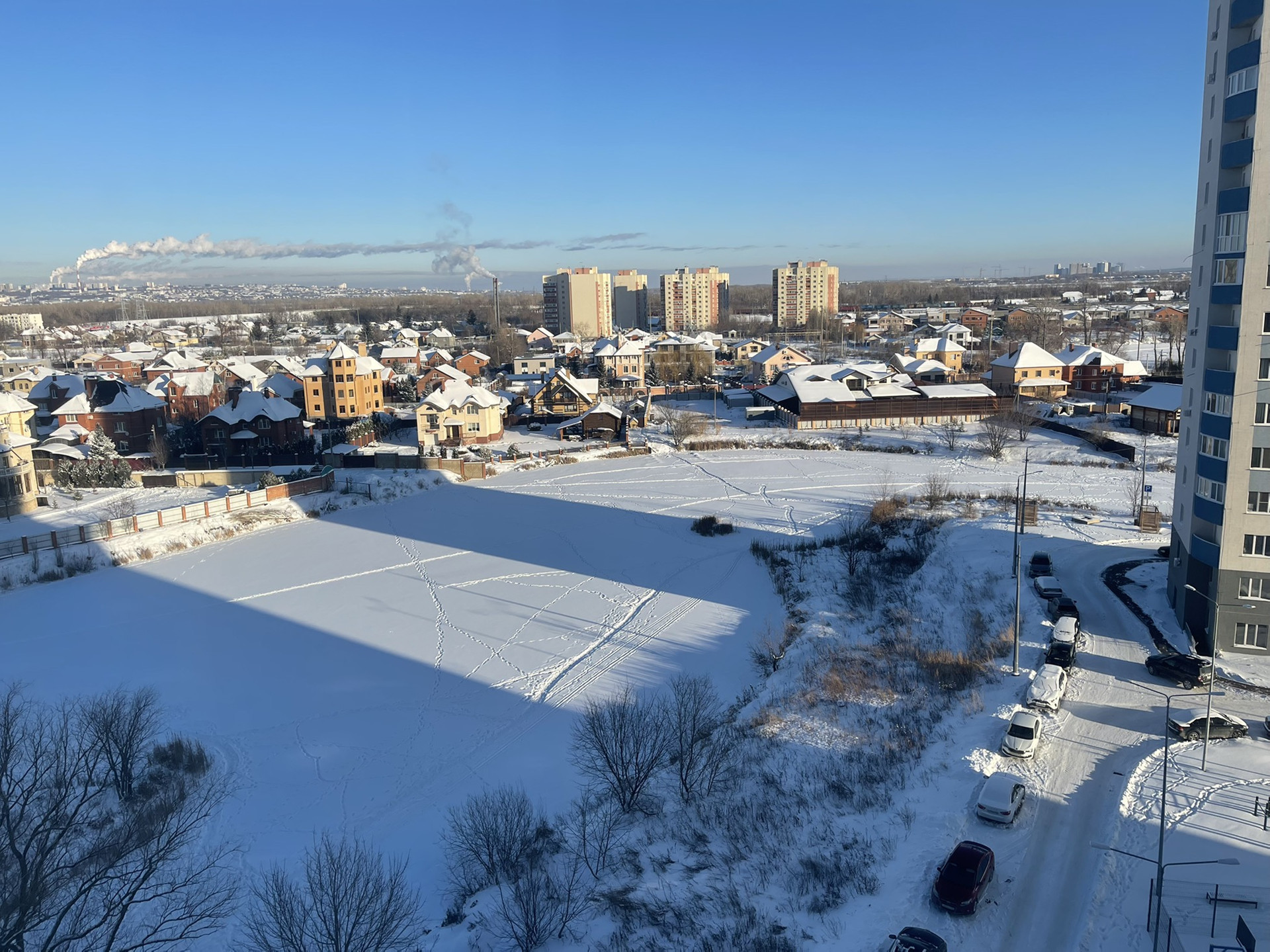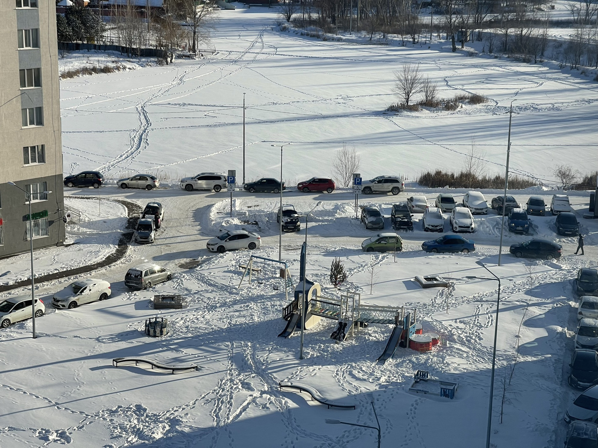 Рядом с домом огромная асфальтированная охраняемая стоянка