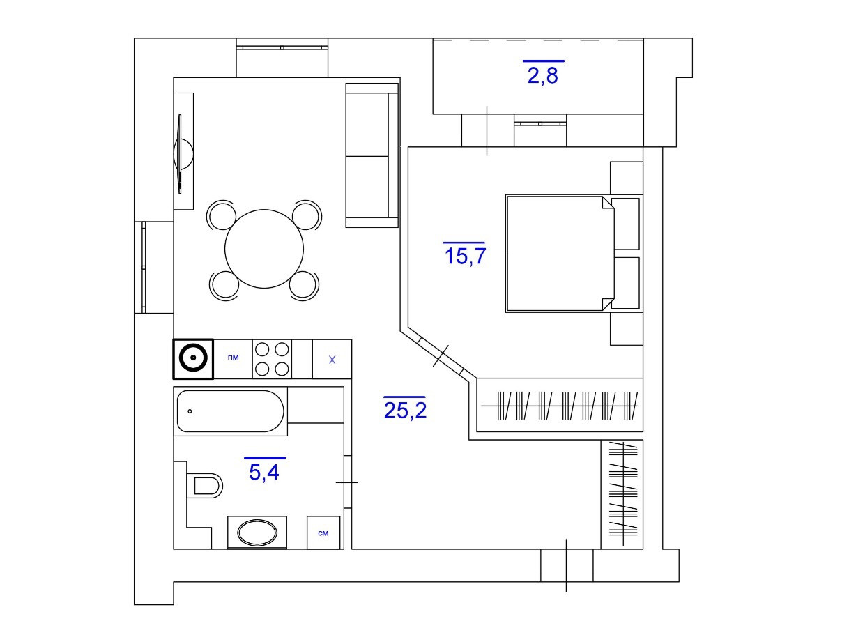 Общая площадь 49,1 кв.м, большая спальня 15,7 и просторная кухня-гостиная 25,2 кв.м с прихожей