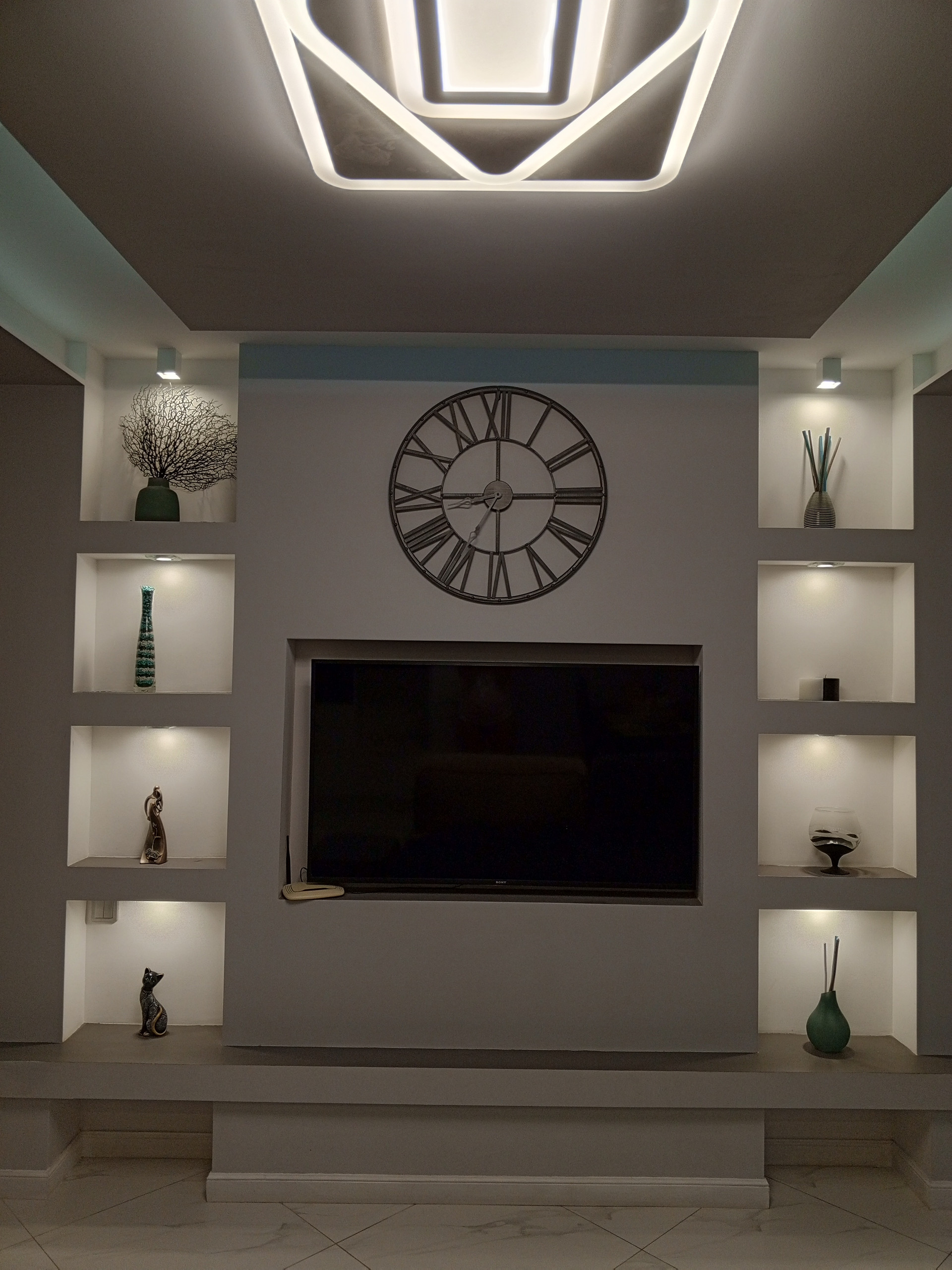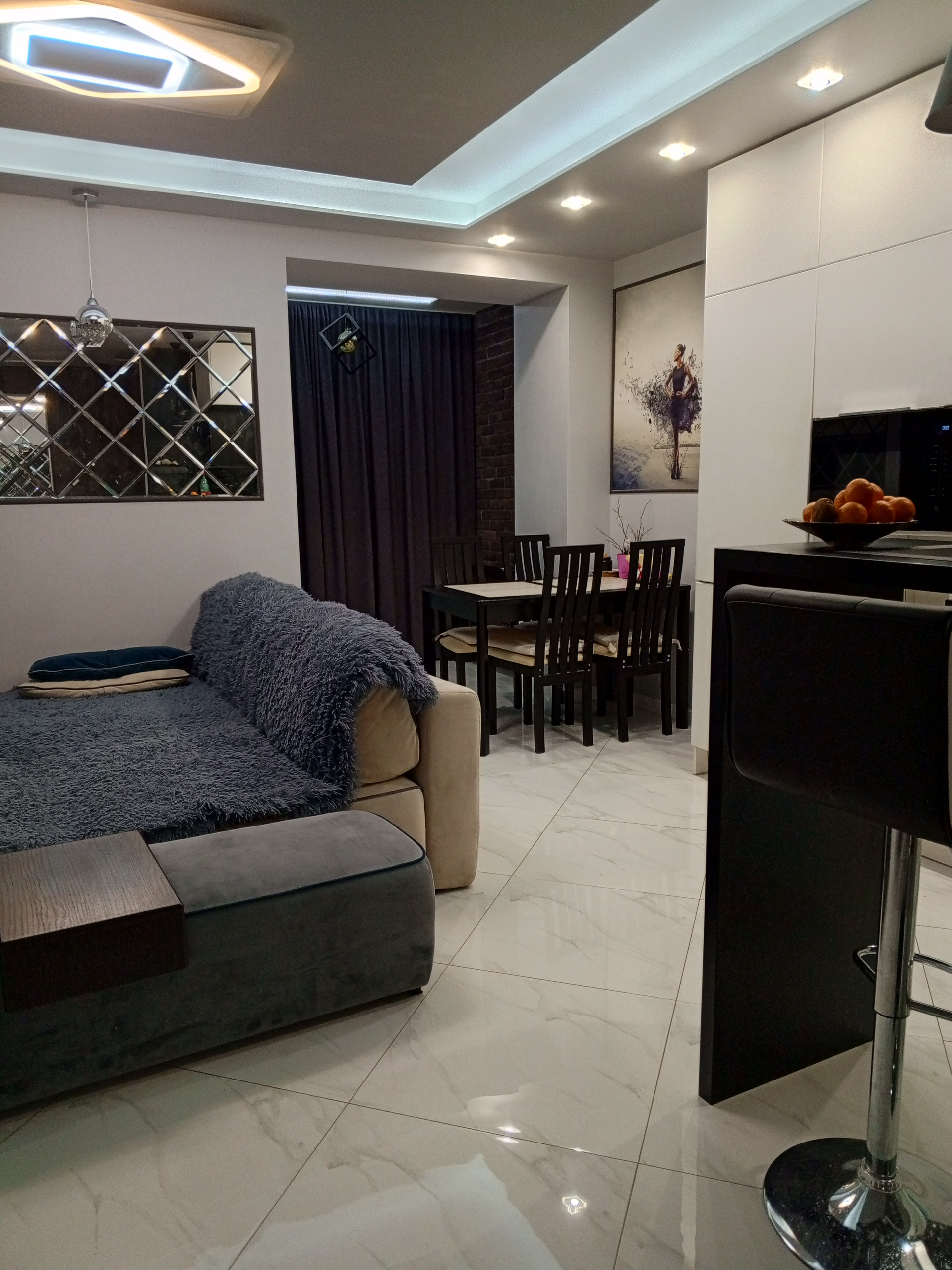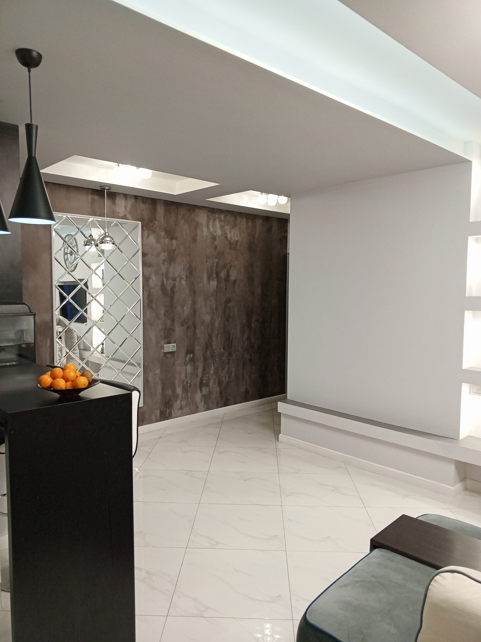 Очень светлая квартира. Все потолки с дополнительной подсветкой.