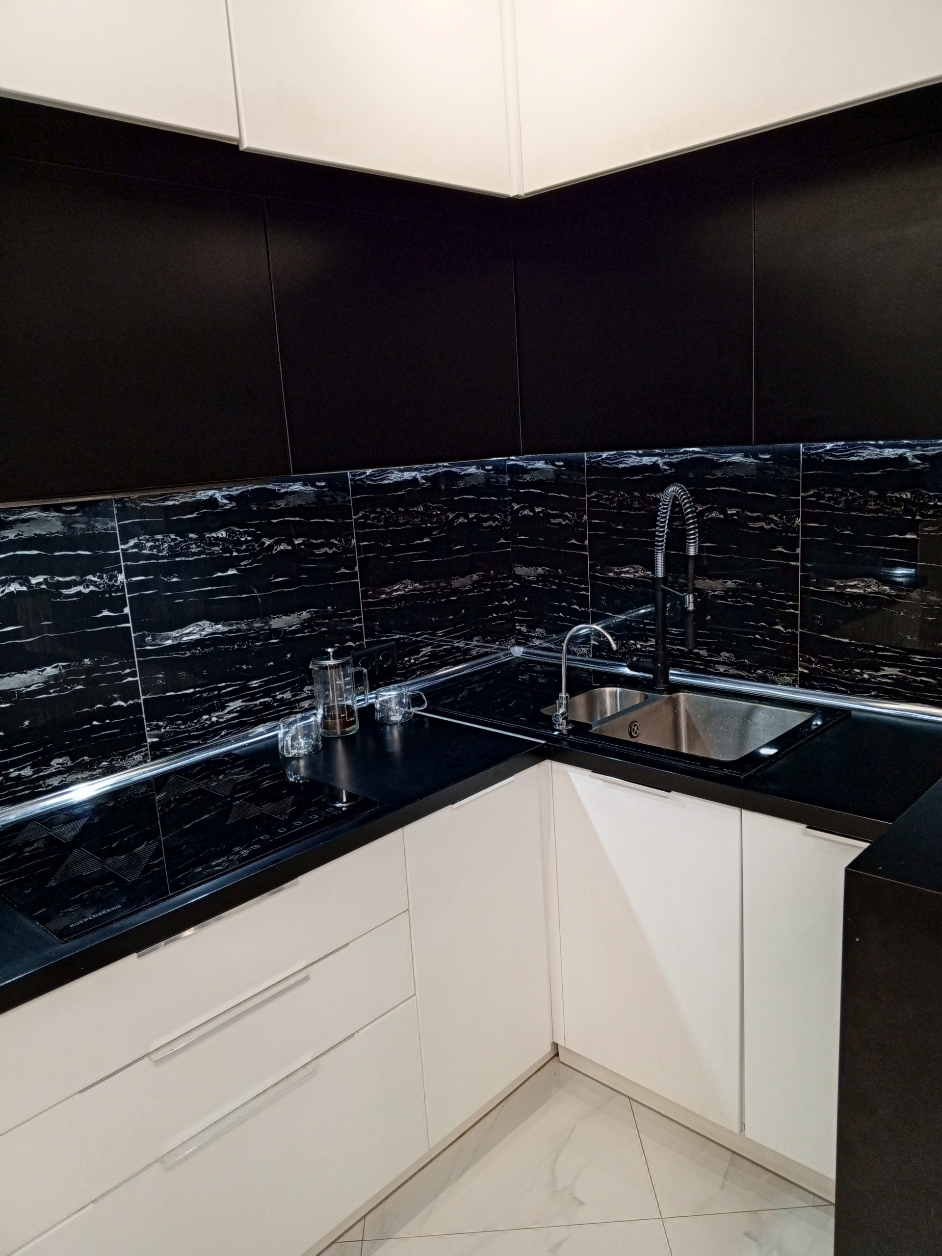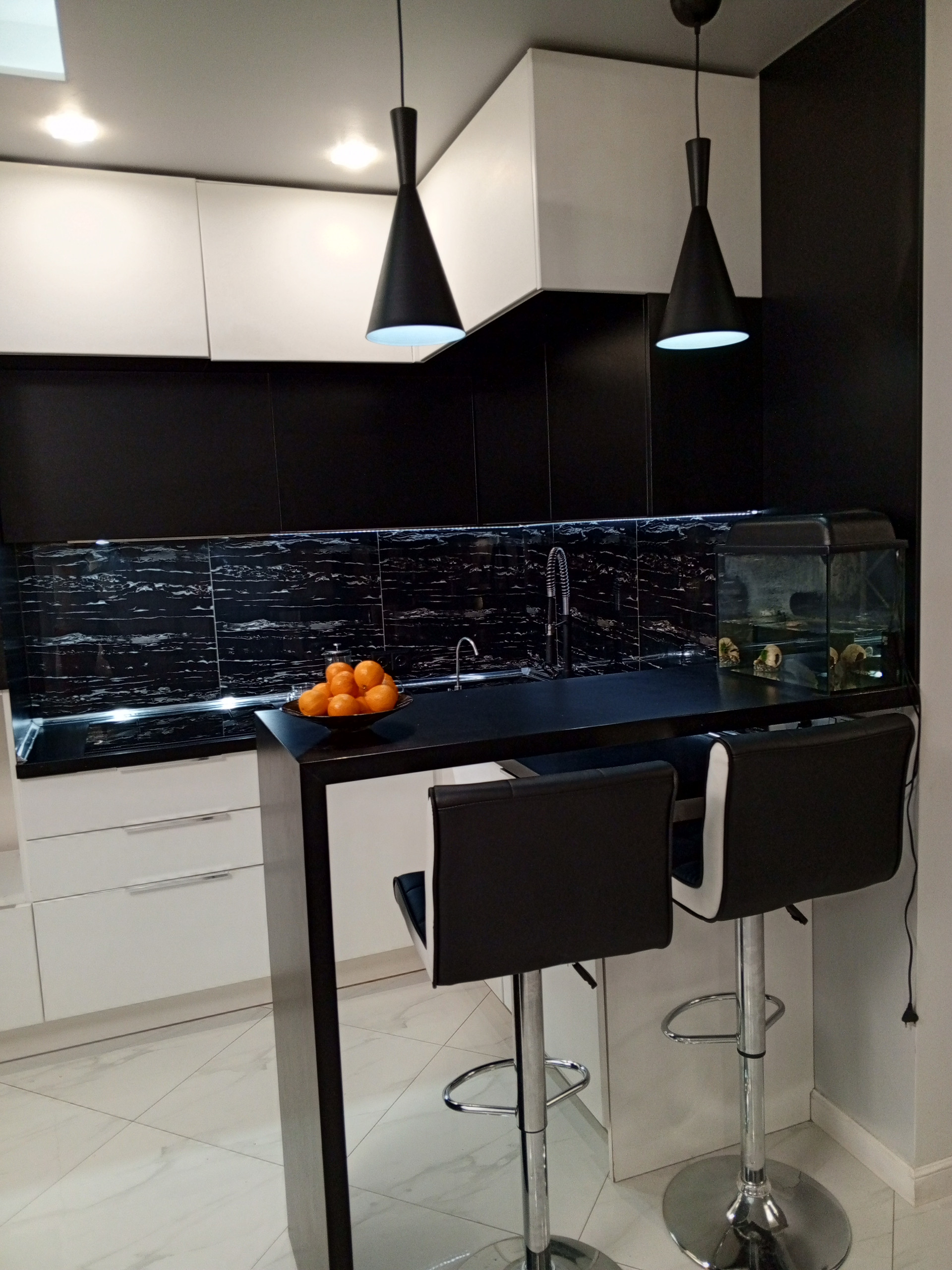 Оставляем кухонный гарнитур с встроенной техникой :холодильник, микроволновая печь, духовой шкаф, посудомоечная машина.