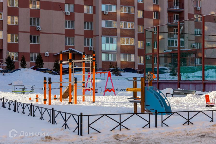 Во дворе дома в зимнее время заливается каток для катания на коньках. Современная детская площадка.
