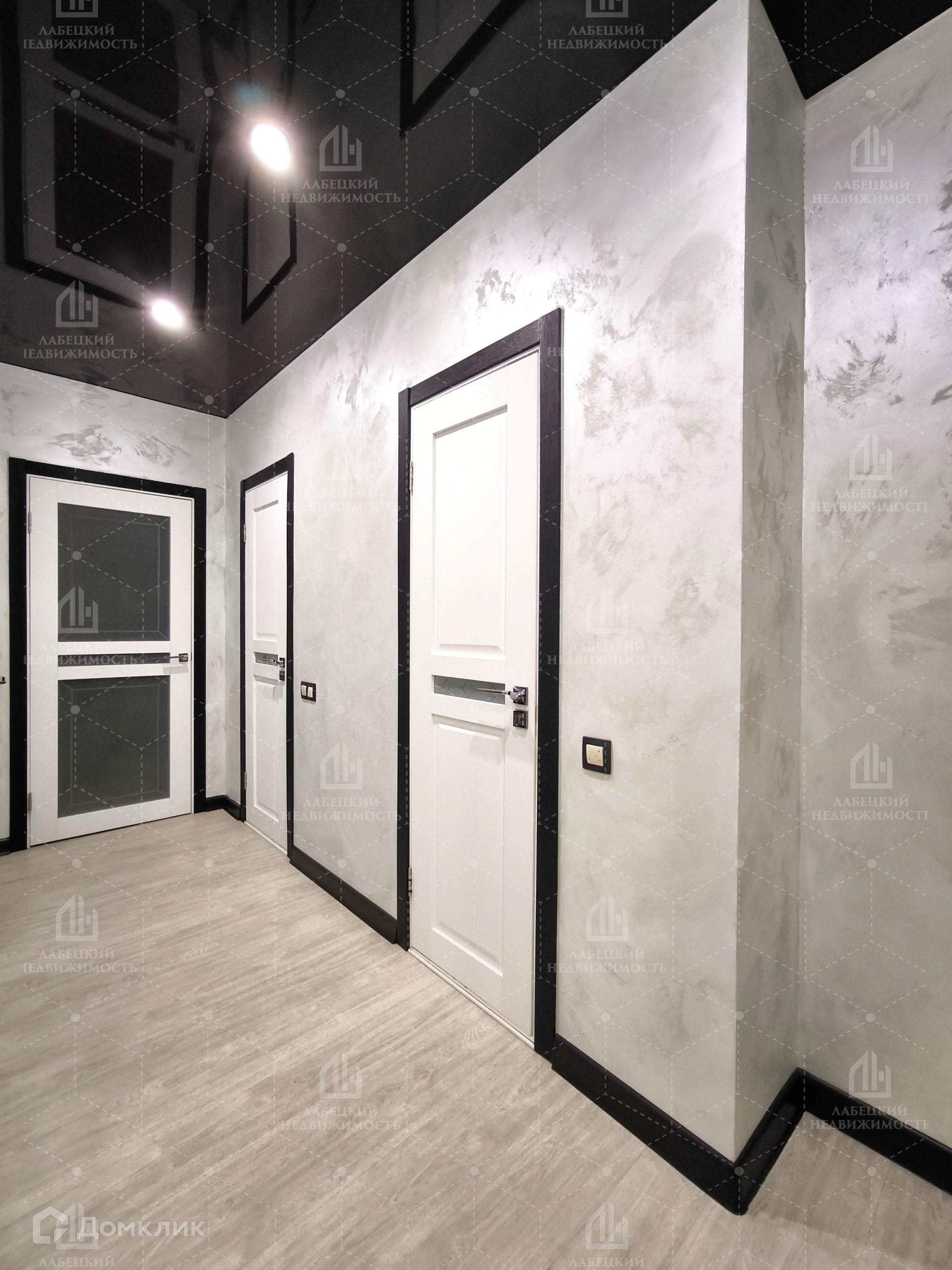 Напольное покрытие в санузле и во входной зоне в прихожей - керамогранитная плитка, остальное покрытие – линолеум. Двухуровневые потолки.
