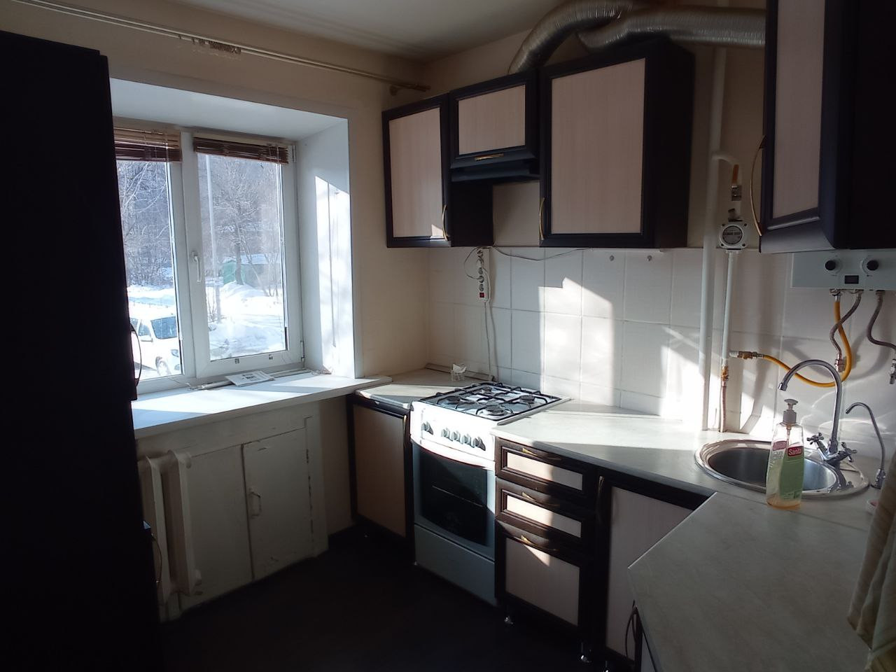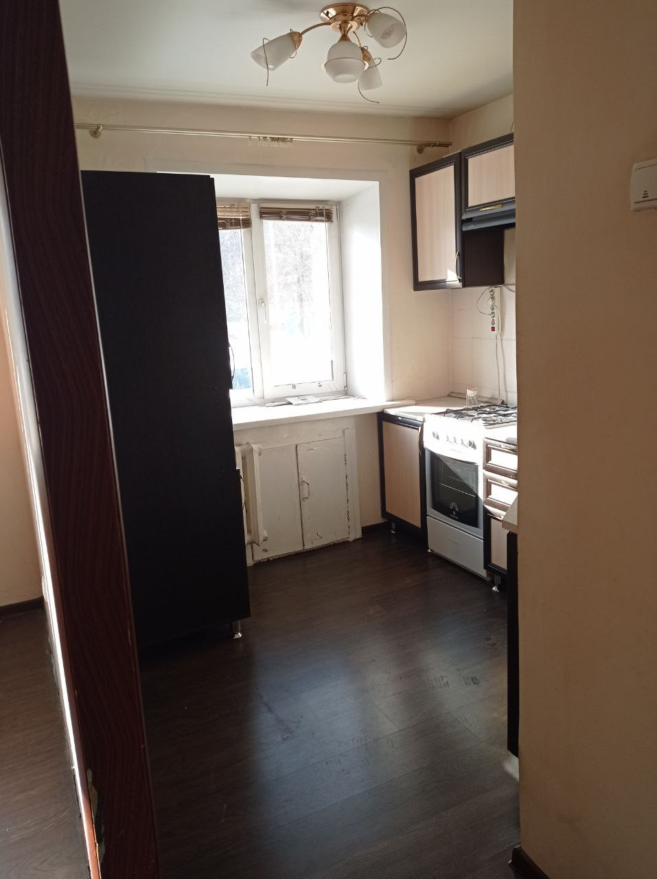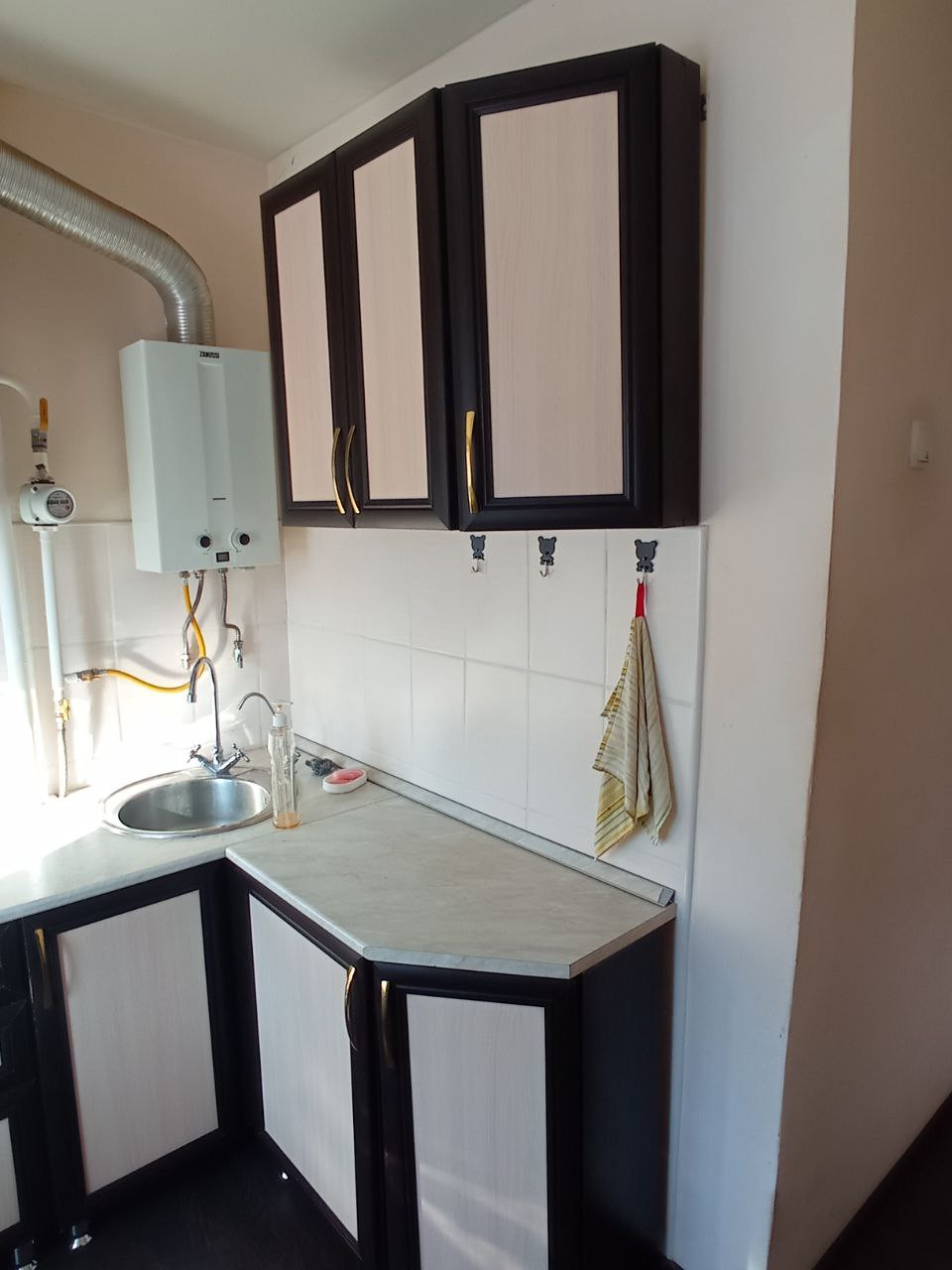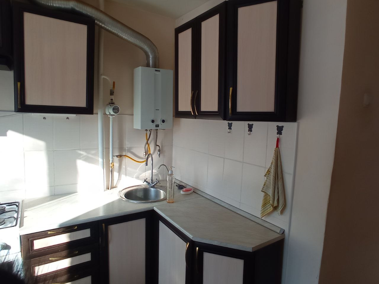 Отопление - чугунные батареи, протечек нет. Трубы заменены на пластиковые. На кухне установлен кухонный гарнитур, газовая плита Greta, газовая колонка Zanussi, газовый счетчик. Санузел совмещенный, на полу и стенах плитка. Входная дверь металлическая.