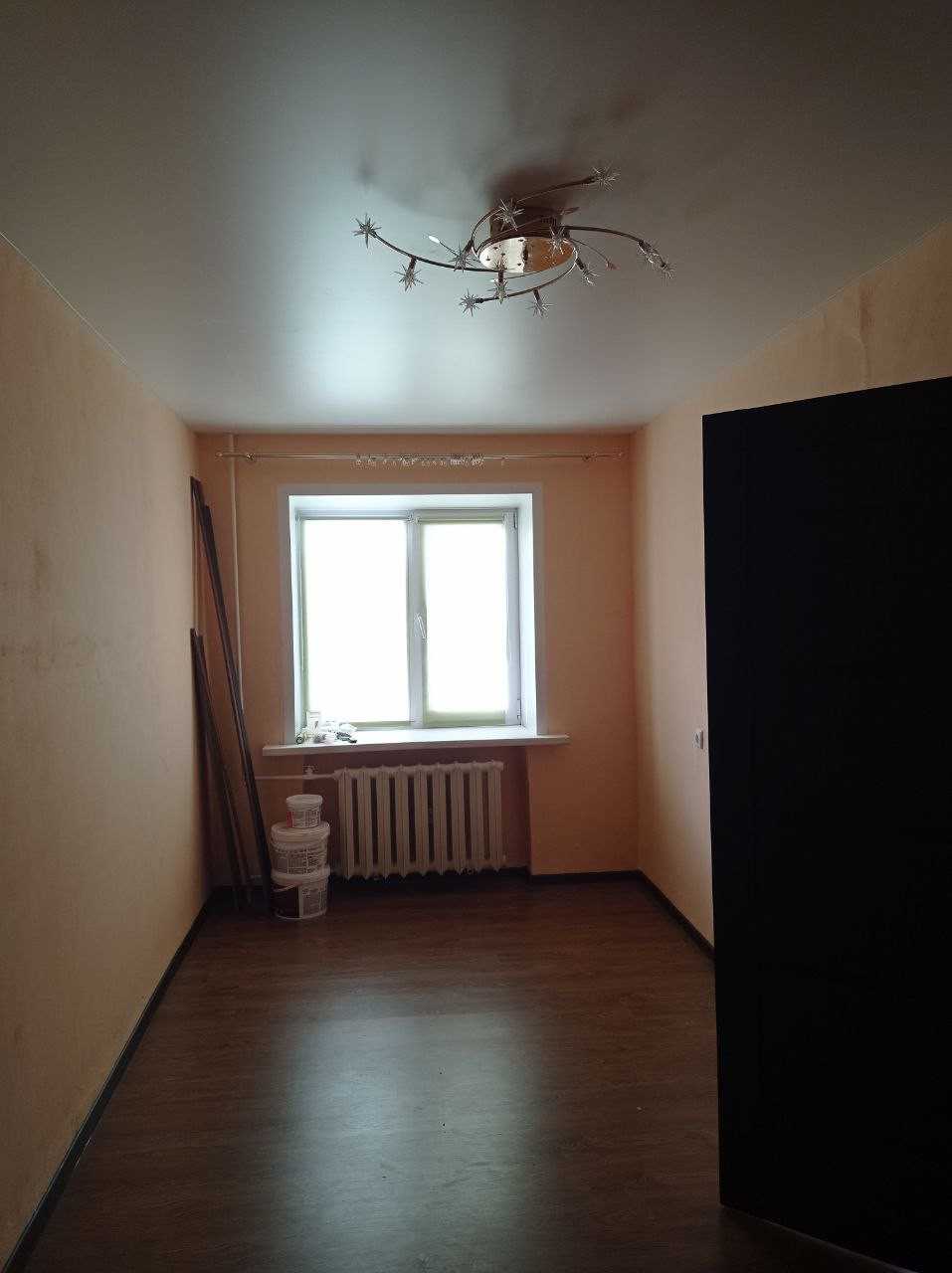 Потолок во всех комнатах натяжной, стены окрашены декоративной краской. На полу в комнатах ламинат. Окна пластиковые.