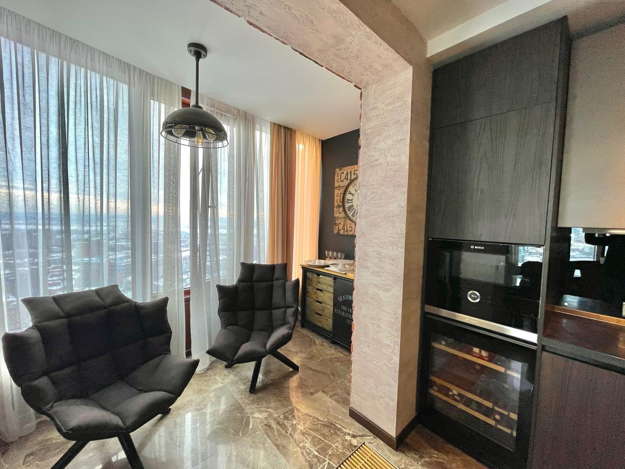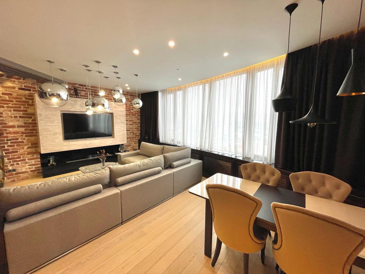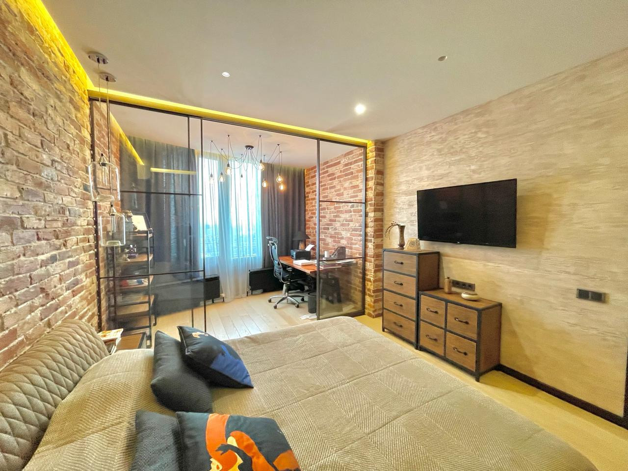В квартире выполнен дизайнерский ремонт в стиле  Лофт. Использовались дорогие качественные строй материалы, техника BOSCH, итальянская мебель. Система кондиционирования, теплые полы, био камин, высокие потолки 3м.