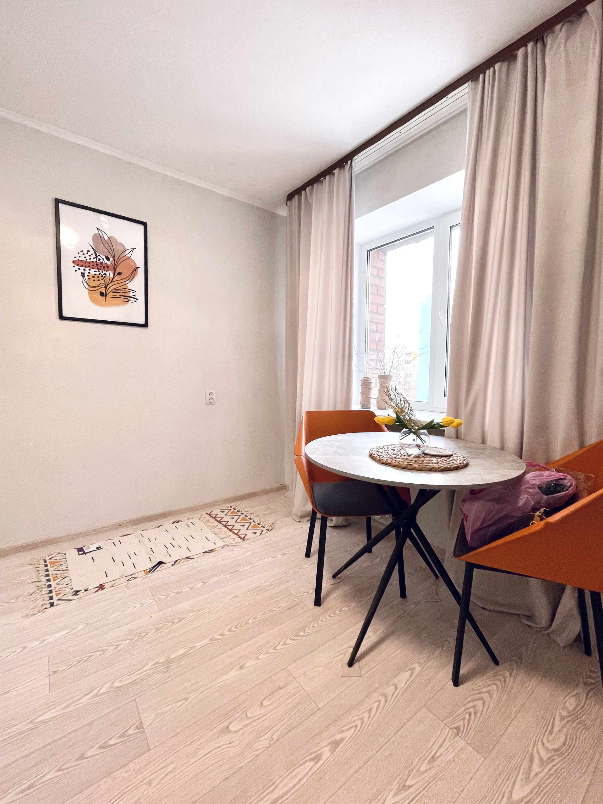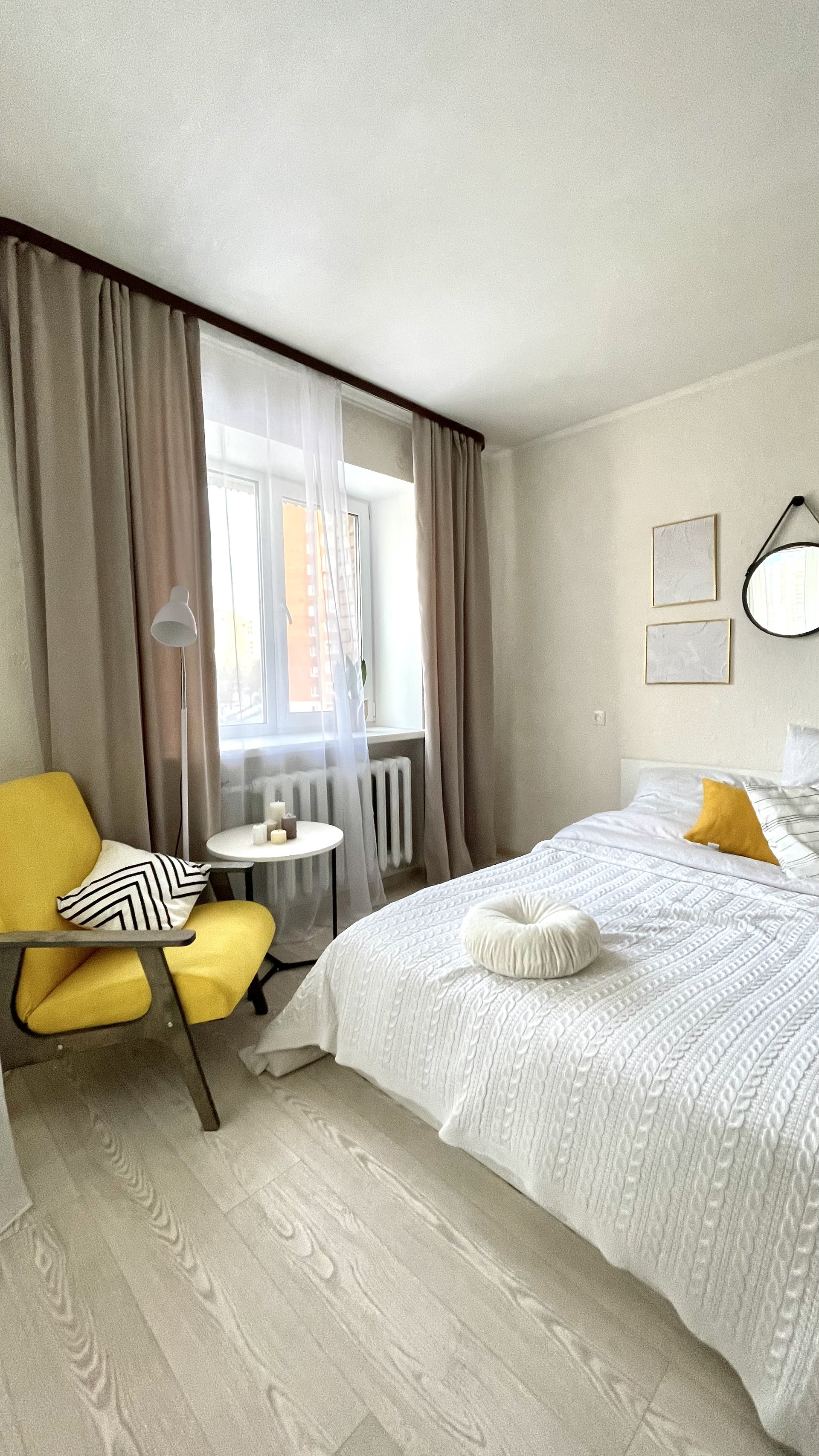 Обновила полностью  стены, полы, двери, светильники.,новые текстиль, декор, кровать, стол, стулья. Все остается.