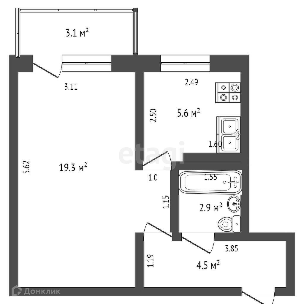 Общая площадь 30.7 м2