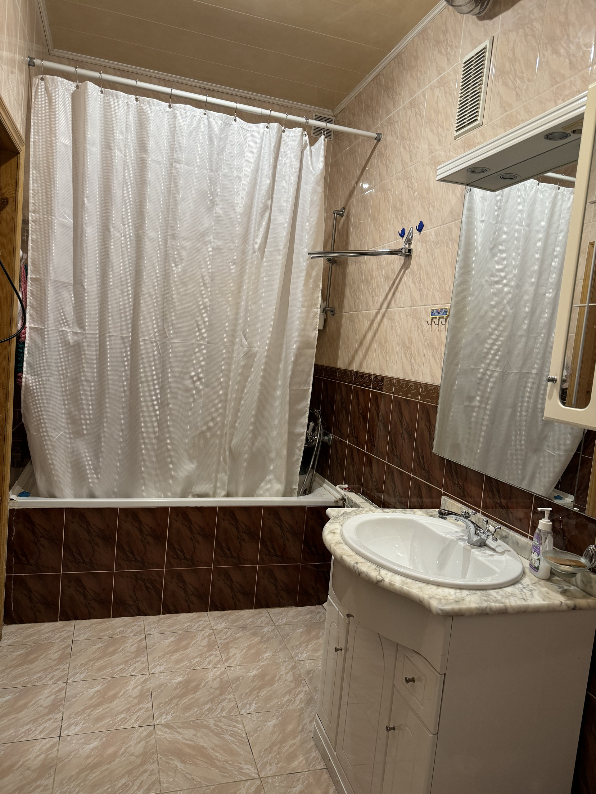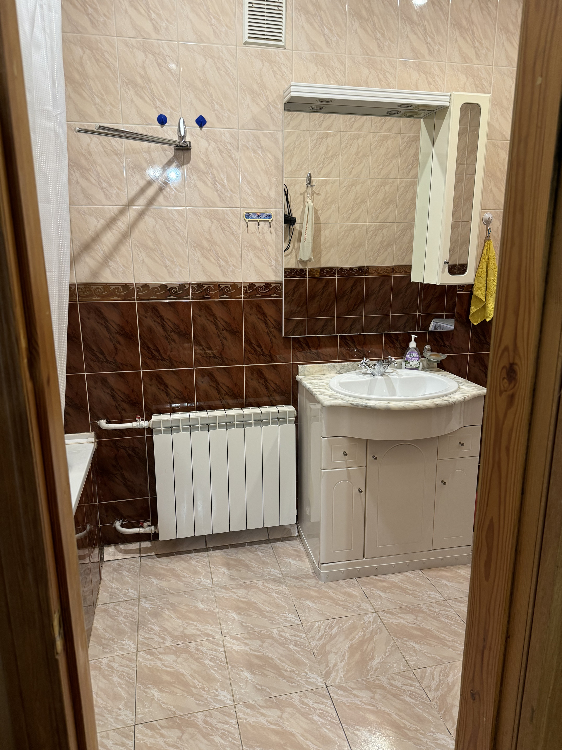 В квартире современная газовая колонка, которая позволяет не зависеть от потенциальных летних отключений горячего водоснабжения.