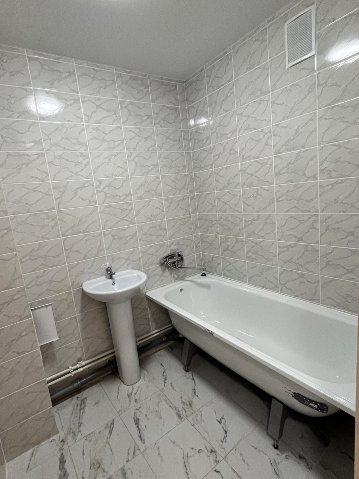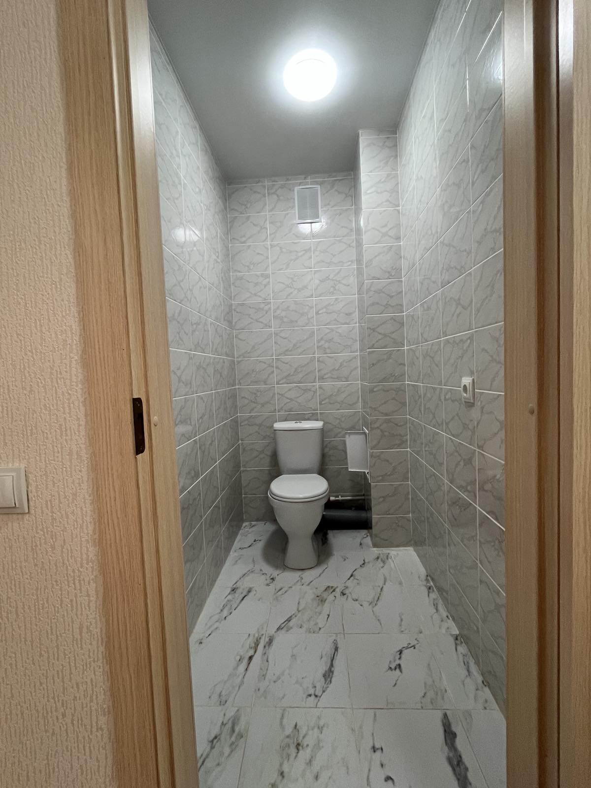 Раздeльный с/у, отдeлан свeтлoй плиткой под мрамор