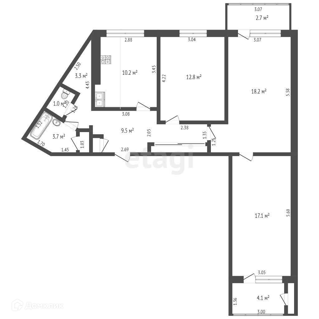 Комнаты имеют следующие площади: 18,2; 17,1; 12,8 квадратных метра. В квартире также есть кухня 10,2 квадратных метра, большой коридор-прихожая 9,5 квадратных метра и кладовая 3,3 квадратных метра.