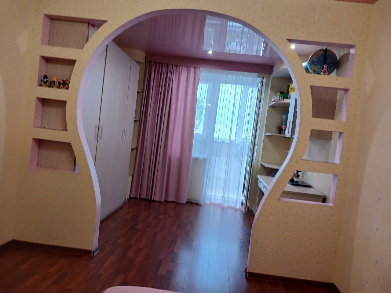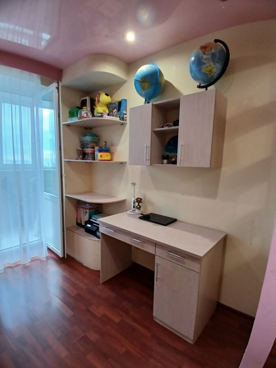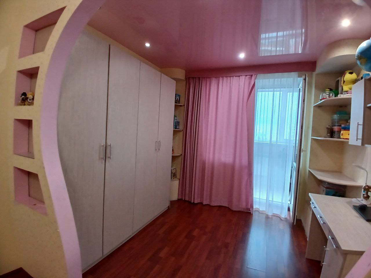 Детская комната выходит на солнечную сторону. Оттуда имеется выход на утеплённую лоджию, где можно организовать дополнительно рабочую зону с шикарным видом на Волгу. Также на лоджии имеется встроенный шкаф, очень удобно для хранения сезонной одежды и обуви.