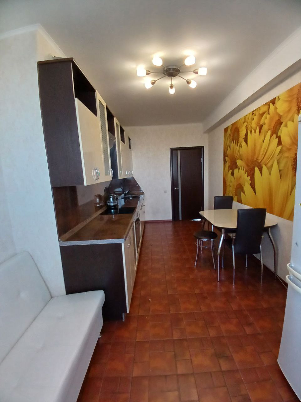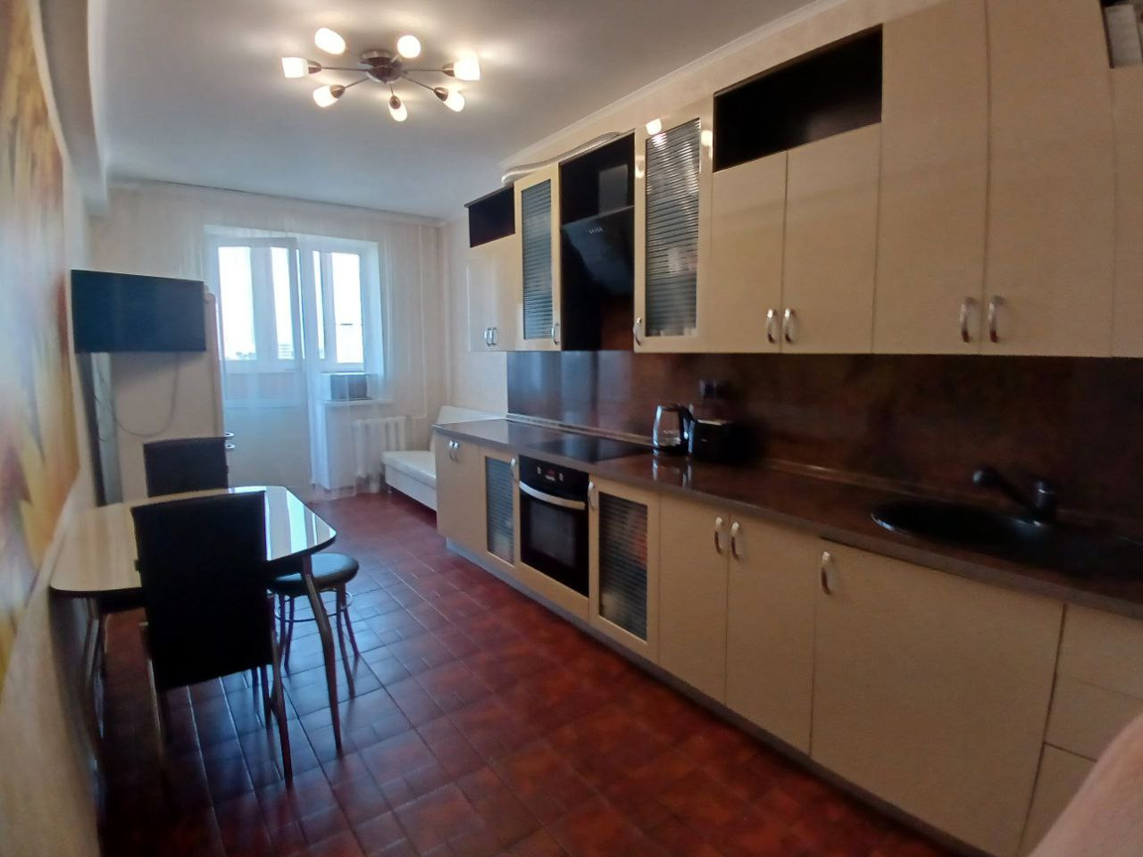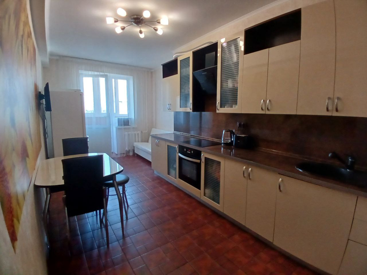 На кухне остаётся кухонный гарнитур со всей встроенной техникой, фасады из крашенного МДФ очень качественные.