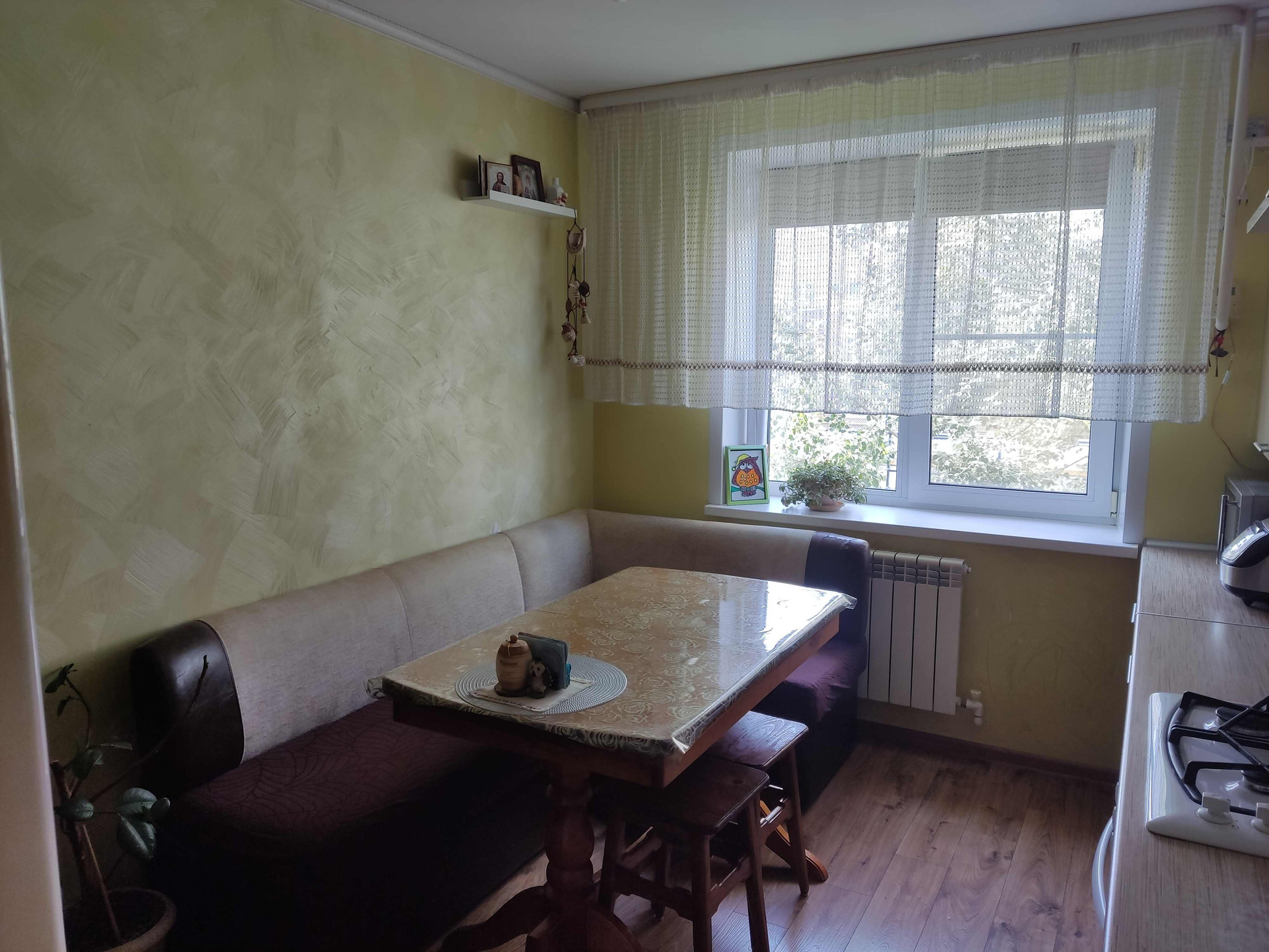 Кухня площадью 12 квадратных метров предоставит вам достаточно места для кулинарного творчества. В квартире выполнен качественный ремонт,  благодаря которому вы сможете сразу заселиться без дополнительных вложений. Санузел совмещённый, что является удобным решением для экономии пространства.