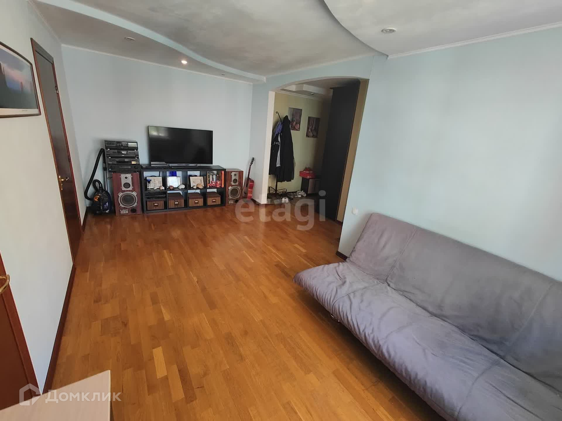 Квартира расположена на среднем этаже панельного дома и имеет общую площадь 61 квадратный метр. Окна выходят на две стороны, обеспечивая хорошее естественное освещение.