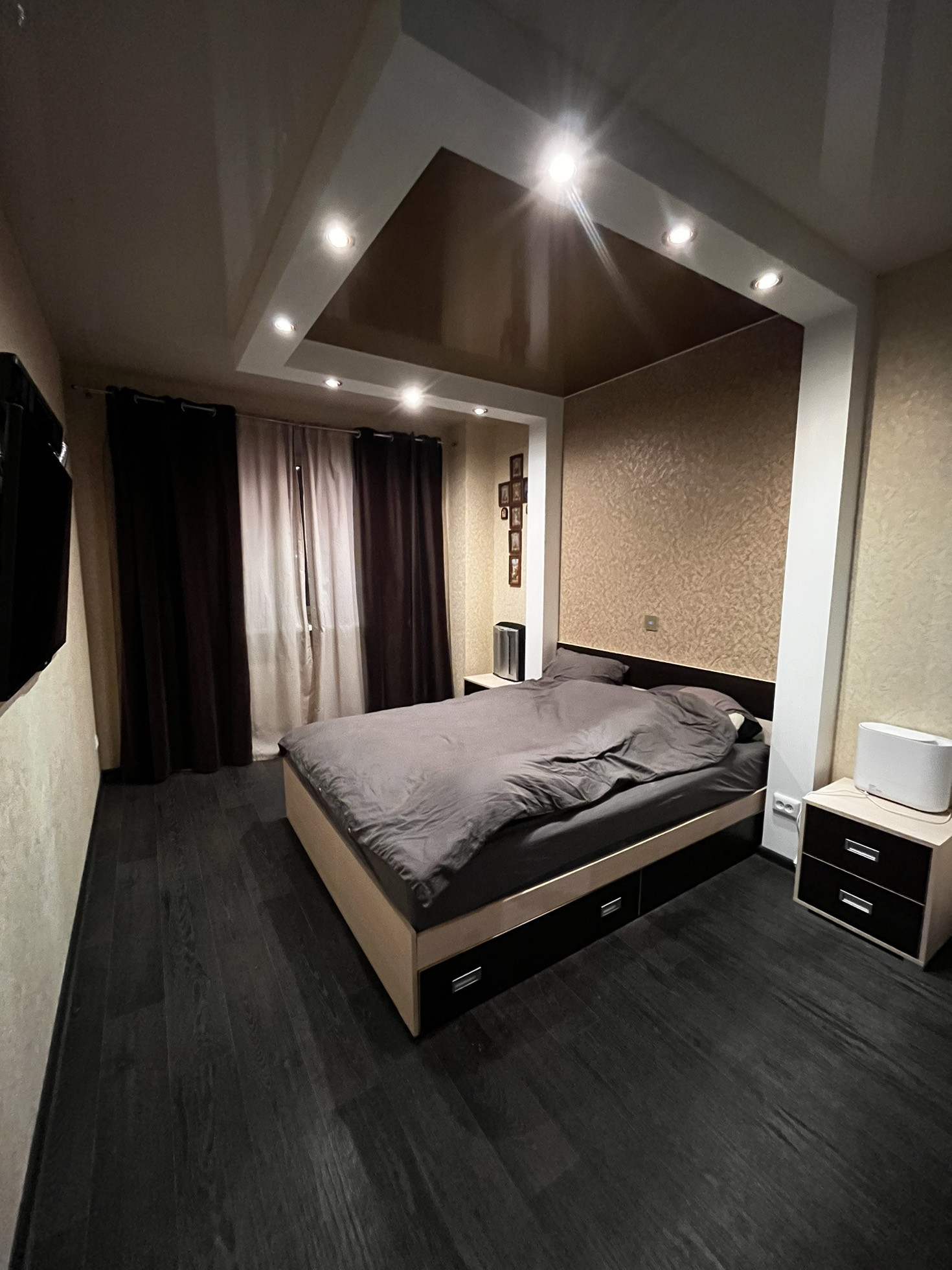 В спальной комнате встроенная система хранения.