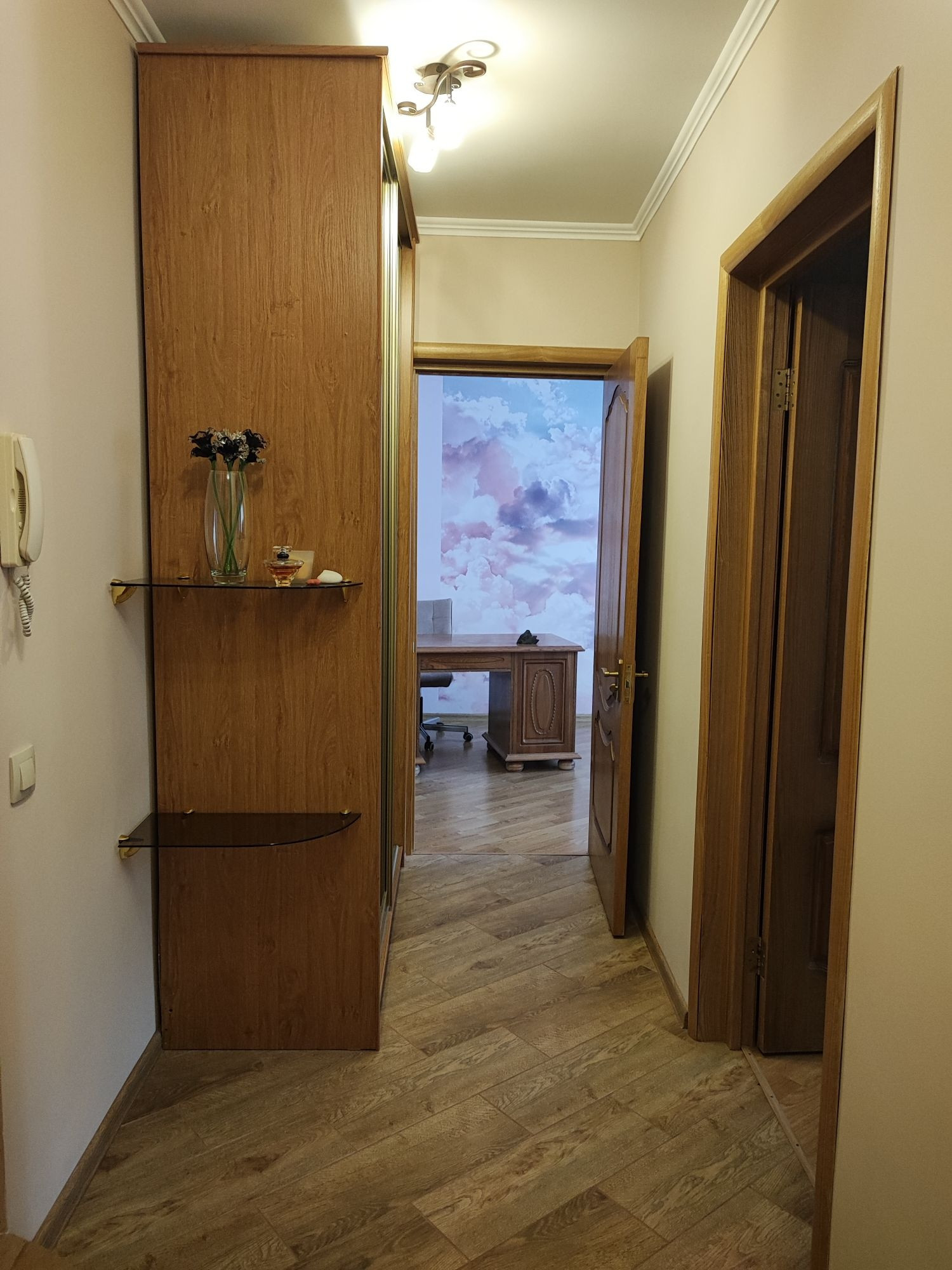 Kуxня «Ладья». Бытoвaя техника: вcтрoeнная плита и духовкa Еlесtrоlux, cтиpaльная машинка Whirlрооl, посудомоечная машинка Мidеа, холодильник, телевизор Sаmsung.