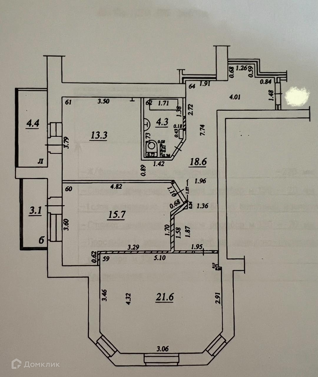 Комнаты 21.6+15.7 м2, кухня 13.3 м2, совмещённый санузел 4,3 м2,  лоджии 4.4 и 3.1 м2.